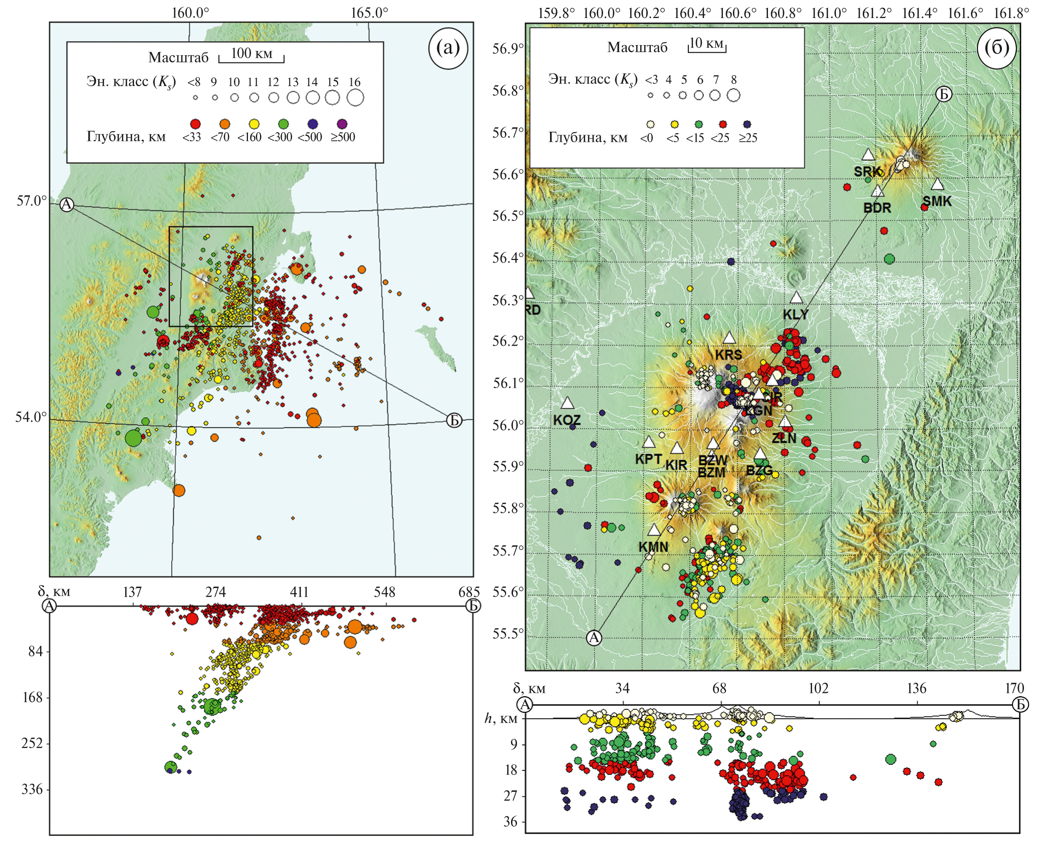 Рис. 4. Карты эпицентров землетрясений, обработанных по сети станций KAGSR+KISS с проекциями гипоцентров на вертикальную плоскость по линии А–Б: (а) – карта и ниже разрез для тектонических землетрясений; (б) – карта и ниже разрез для локальных вулканических землетрясений (район выделен на карте (а)).