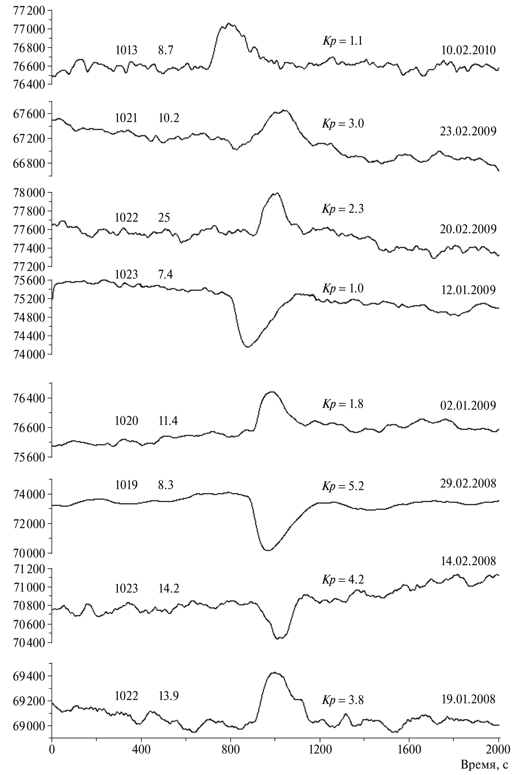На ближайшей к эпицентру станции LCO один импульс появился в 2008 г., а в 2009 г. их было много. Примеры импульсов, не искаженных землетрясениями или помехами неизвестного происхождения, приведены на рис. 3. Слева от импульсов указаны величины атмосферного давления и скорости ветра в день возникновения соответствующего импульса. Для этого использованы данные метеообсерватории La Seren, расположенной в 50 км от сейсмостанции LCO. Данные о приведенных на рисунке индексах геомагнитной активности получены из архива http//www.spaceweatherlive.com. В таблицах архива указаны величины планетарных Kp-индексов – отклонений магнитного поля Земли от нормы в течение трехчасовых интервалов соответствующих суток (GFZ Potsdam official Kp-index). Значения Kp-индексов при самых сильных бурях достигают величины 9.