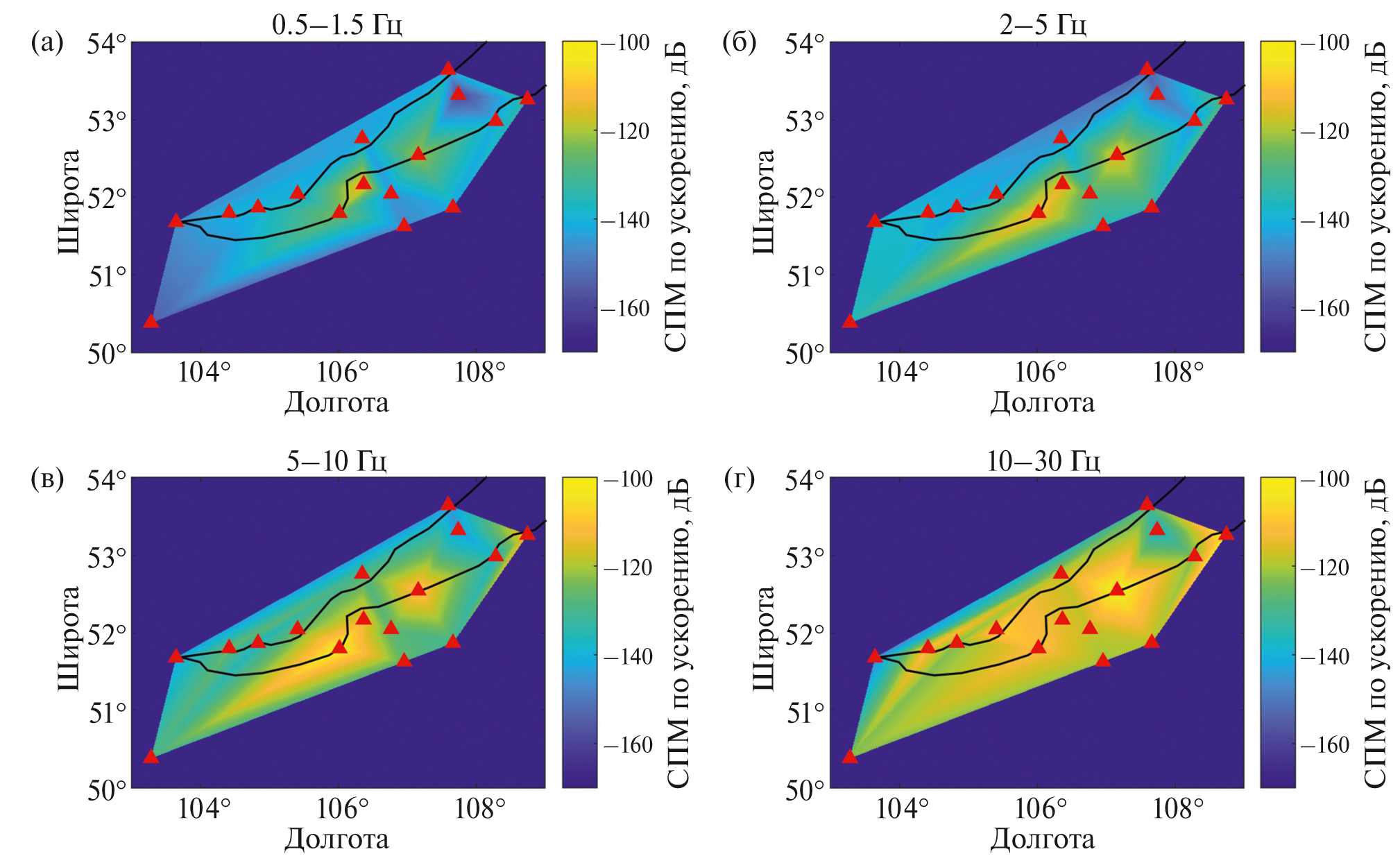 На основе обзора сведений о частотном составе микросейсмического шума [Беседина, Тубанов, 2023] и предварительного анализа данных для дальнейшей работы выбирались данные в нескольких интервалах частот (0.1–0.4 (для широкополосных станций); 0.5–1.5; 2–5; 5–10; 10–30 Гц). При анализе записей короткопериодных станций учитывалась нижняя граничная частота датчиков 0.5 Гц, и анализ проводился в рабочем диапазоне частот измерительного канала. Комплексный анализ данных всех станций позволил проследить пространственно-временные вариации микросейсмического шума вблизи озера Байкал с шагом 1 месяц. В качестве примера на рис. 4 показаны пространственные вариации шума за август 2020 г. Для выделенных диапазонов частот 0.5–1.5; 2–5; 5–10; 10–30 Гц на всей территории Прибайкалья наибольшую интенсивность имеет СПМ в диапазоне 10–30 Гц, который обусловлен главным образом антропогенными источниками (см., например, статью [Webb, 2002]).