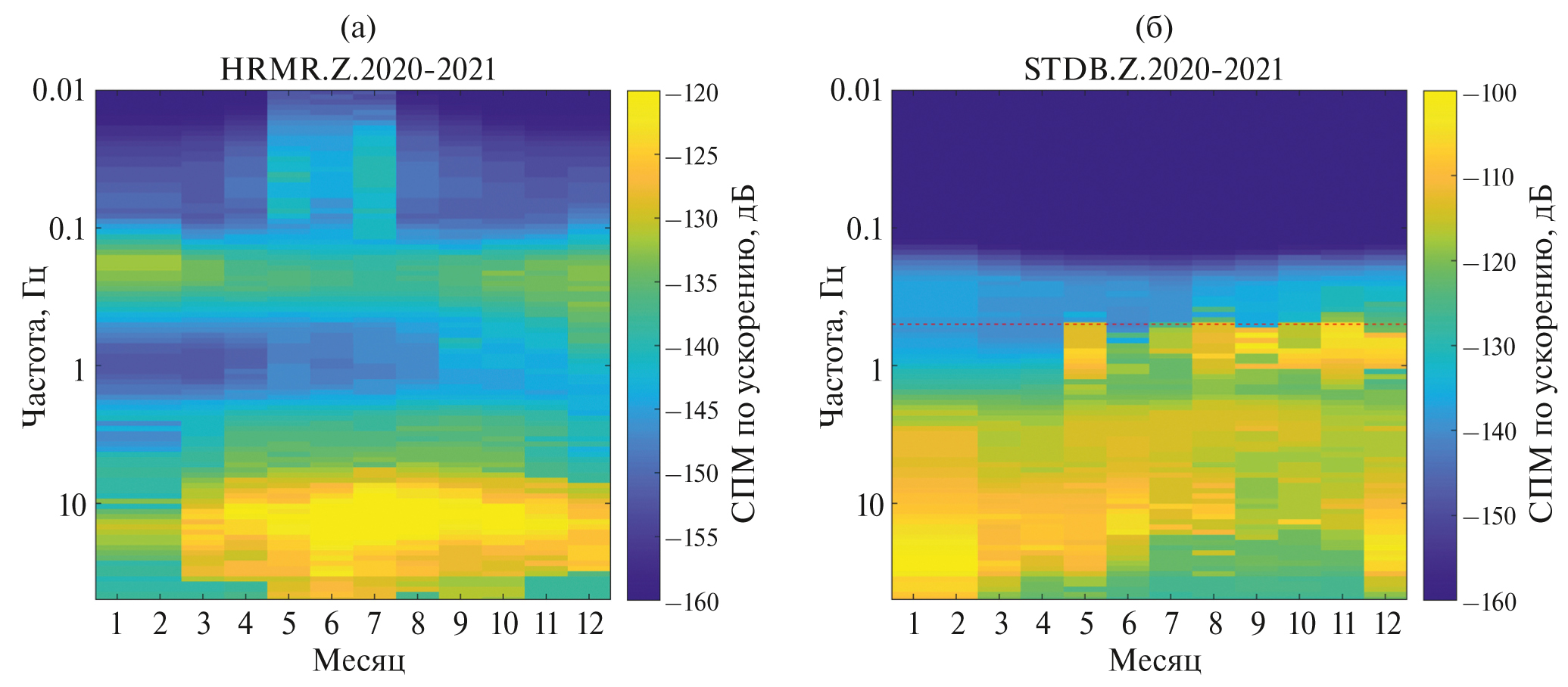 Рис. 6. Сезонные вариации микросейсмического шума за 2020–2021 гг. для: (а) – широкополосной станции Хурамша (HRMR); (б) – короткопериодной станции Степной дворец (STDB); пунктир соответствует нижней граничной полосе короткопериодных датчиков 0.5 Гц.