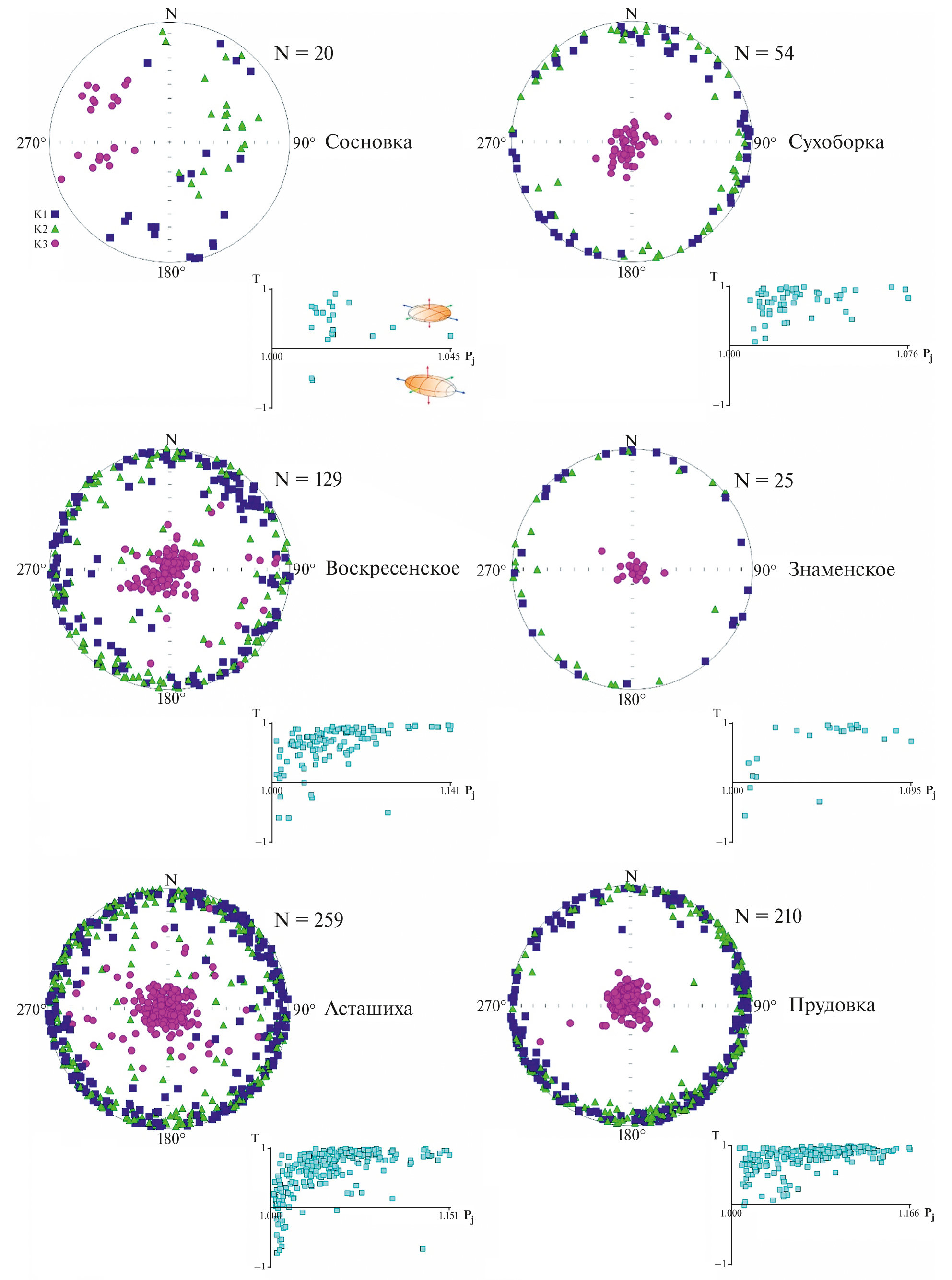Степень АМВ (Pj) составляет в разрезе Сосновка около 1%, не более 6% в разрезе Сухоборка, не более 8% в разрезе Знаменское и не более 14% в разрезах Воскресенское, Асташиха и Прудовка (рис. 2). Эллипсоиды АМВ, за редким исключением, имеют уплощенную форму. Расположение осей эллипсоидов АМВ во всех разрезах, кроме разреза Сосновка, схожее: минимальные оси ориентированы субвертикально, а промежуточные и максимальные равномерно распределены в горизонтальной плоскости. Такой характер магнитной текстуры свидетельствует о накоплении пород перечисленных разрезов в спокойных гидродинамических условиях [Hrouda, Tarling, 1993]. Магнитная текстура глинистых известняков и мергелей в основании разреза Сосновка отличается от остальных разрезов и вероятнее всего обусловлена их литологией и, соответственно, минеральным составом, на что указывают существенно более низкие значения степени анизотропии (Pj < 1%) (рис. 2) и удельной магнитной восприимчивости (табл. 1). На данном этапе исследований мы не можем предложить сколько-нибудь обоснованную интерпретацию магнитной текстуры пород разреза Сосновка, однако, учитывая малое значение Pj, склонны считать, что она не оказывает значимого влияния на палеомагнитную запись.