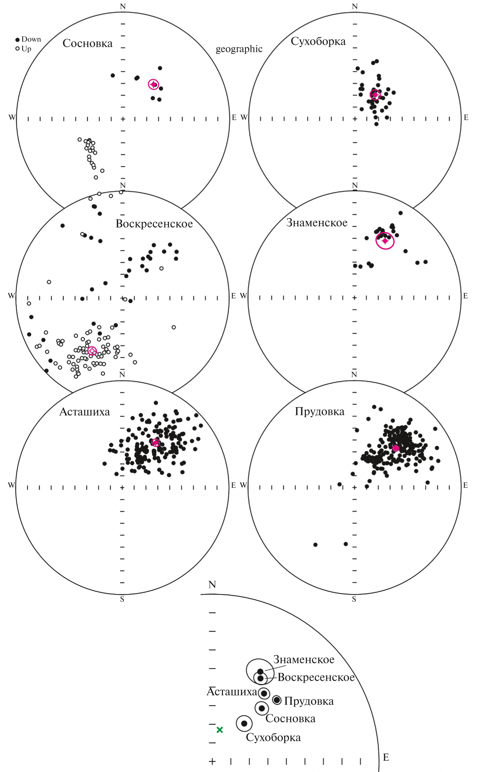 Рис. 5. Распределение единичных направлений характеристической компоненты намагниченности (ChRM) в изученных разрезах на стереопроекциях. Внизу – средние палеомагнитные направления для каждого из изученных разрезов (направления обратной полярности обращены), после применения критерия селекции cut-off “45°”, с кругами 95%-го доверия. Географическая система координат. Зеленый крест обозначает направление современного геомагнитного поля в районе исследований.