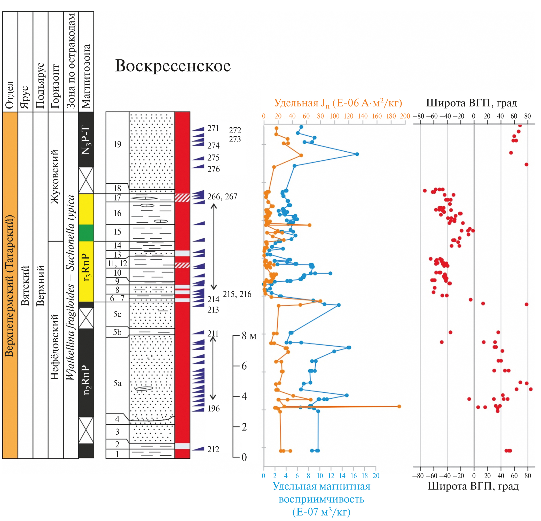 Рис. 8. Разрез Воскресенское: стратиграфия, литология, схема опробования с номерами образцов, удельная естественная остаточная намагниченность (Jn) и удельная магнитная восприимчивость, широта виртуального геомагнитного полюса (ВГП). Условные обозначения см. на рис. 6.