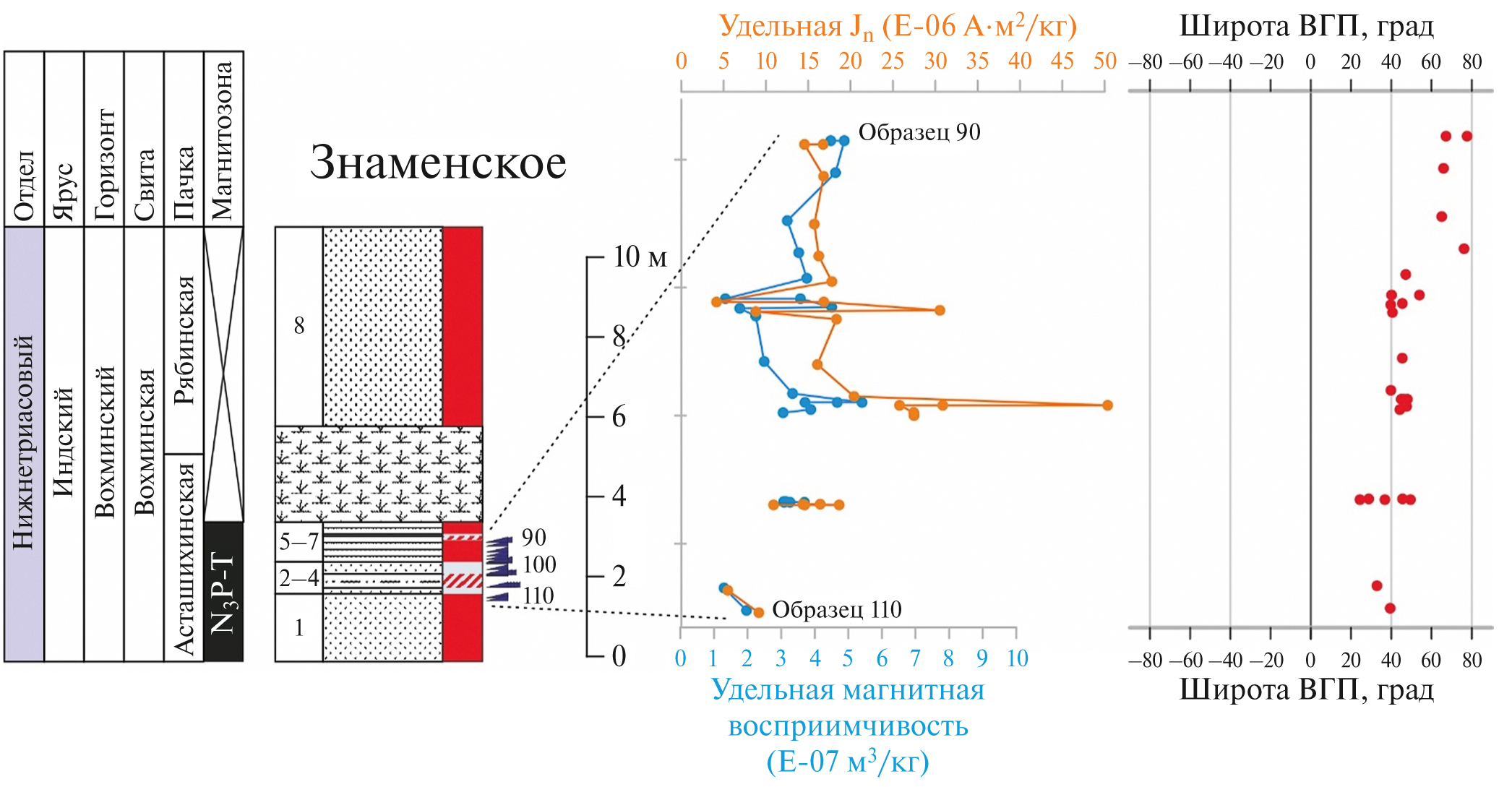 Рис. 9. Разрез Знаменское: стратиграфия, литология, схема опробования с номерами образцов. Графики значений удельной естественной остаточной намагниченности (Jn), удельной магнитной восприимчивости и широты виртуального геомагнитного полюса (ВГП) представлены не в масштабе. Условные обозначения см. на рис. 6.
