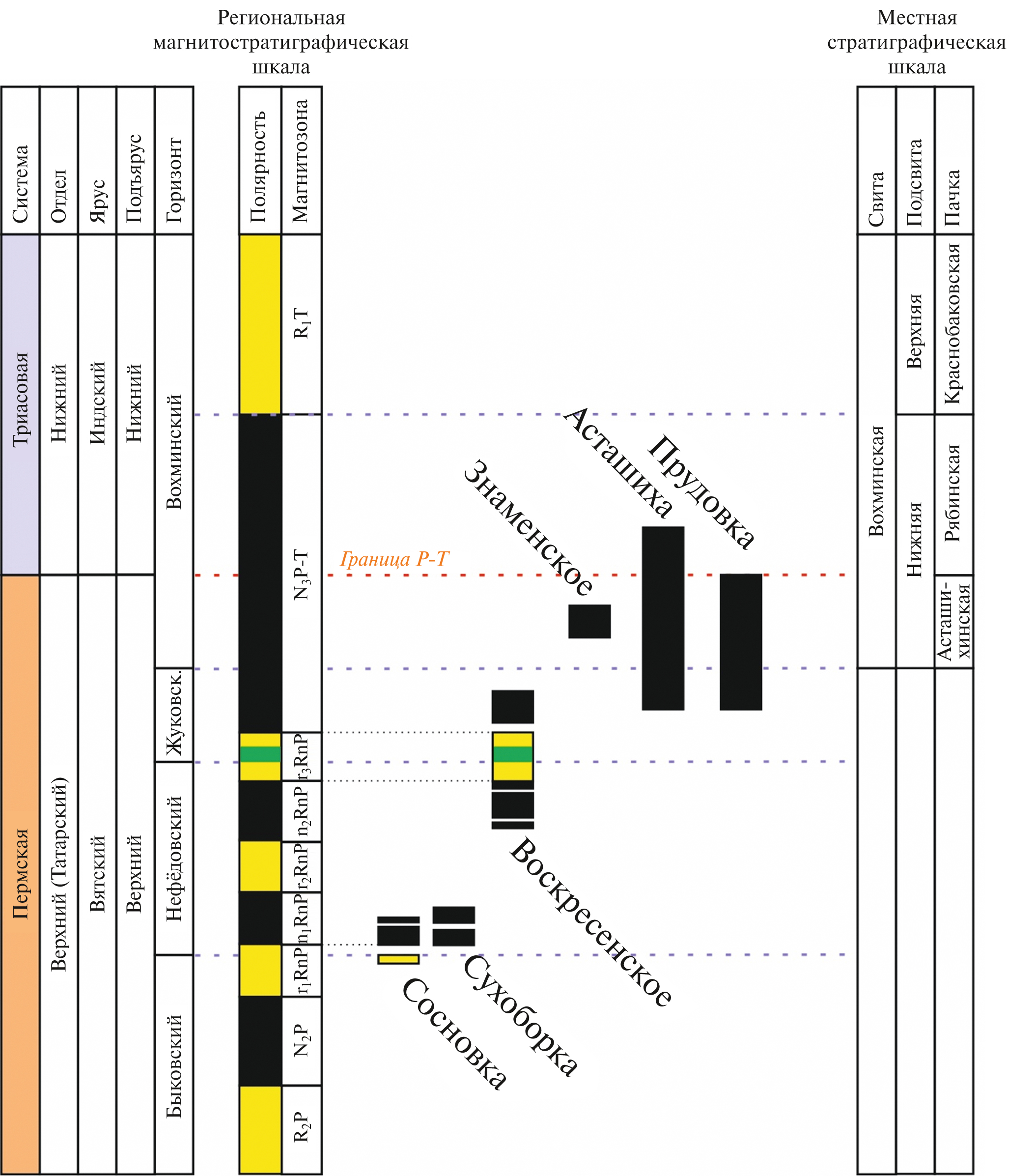 Сводный магнитостратиграфический разрез долины р. Ветлуга изображен на рис. 12 и представлен ортозонами RnP и N3P–T.