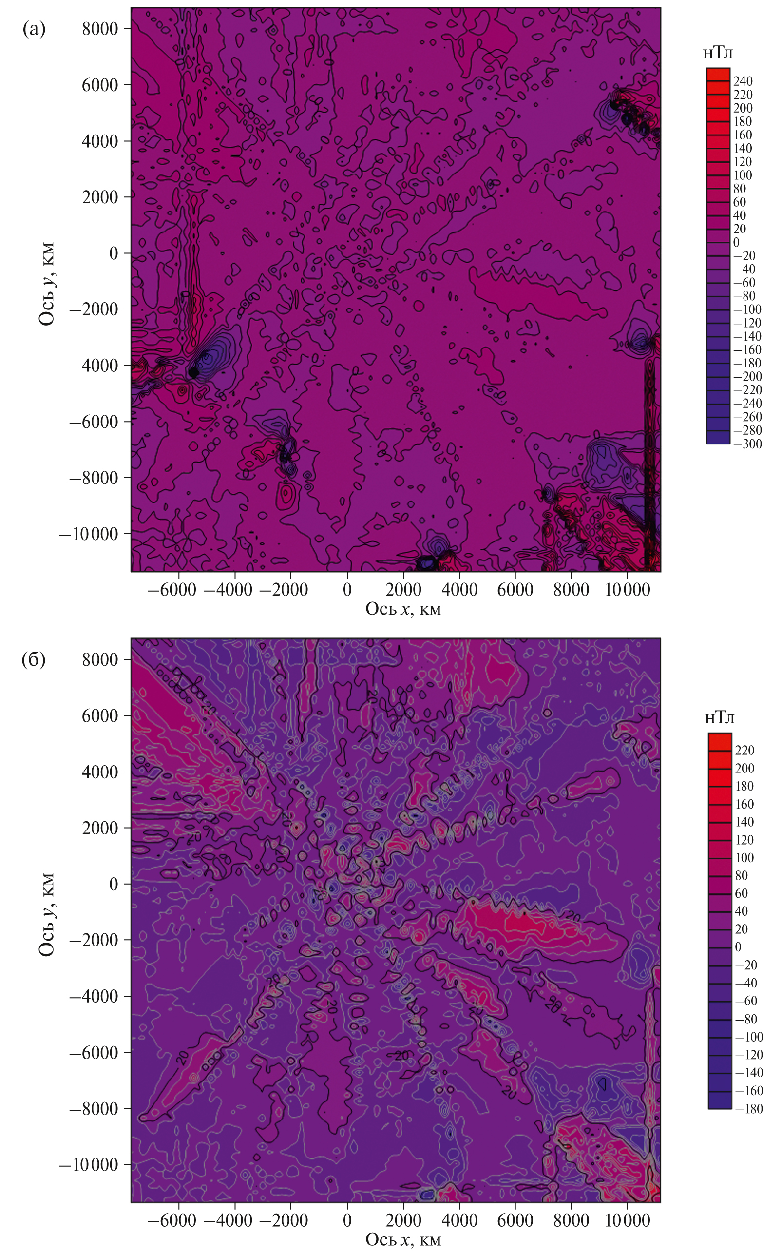 В таблице приводятся результаты аппроксимации магнитного и гравитационного полей по пересчитанным на указанные сферы данным, а также результат решения СЛАУ по “сырым” магнитным данным (пример 1). Примеры 2–3 в таблице соответствуют аппроксимации магнитного поля по синтезированным данным на расстоянии 50 и 100 км от поверхности планеты в рамках структурно-параметрического подхода; примеры 4–6 демонстрируют реализацию структурно-параметрического подхода при нахождении модифицированных региональных S-аппроксимаций синтезированного на расстоянии 10, 50 и 100 км, соответственно, гравитационного поля.