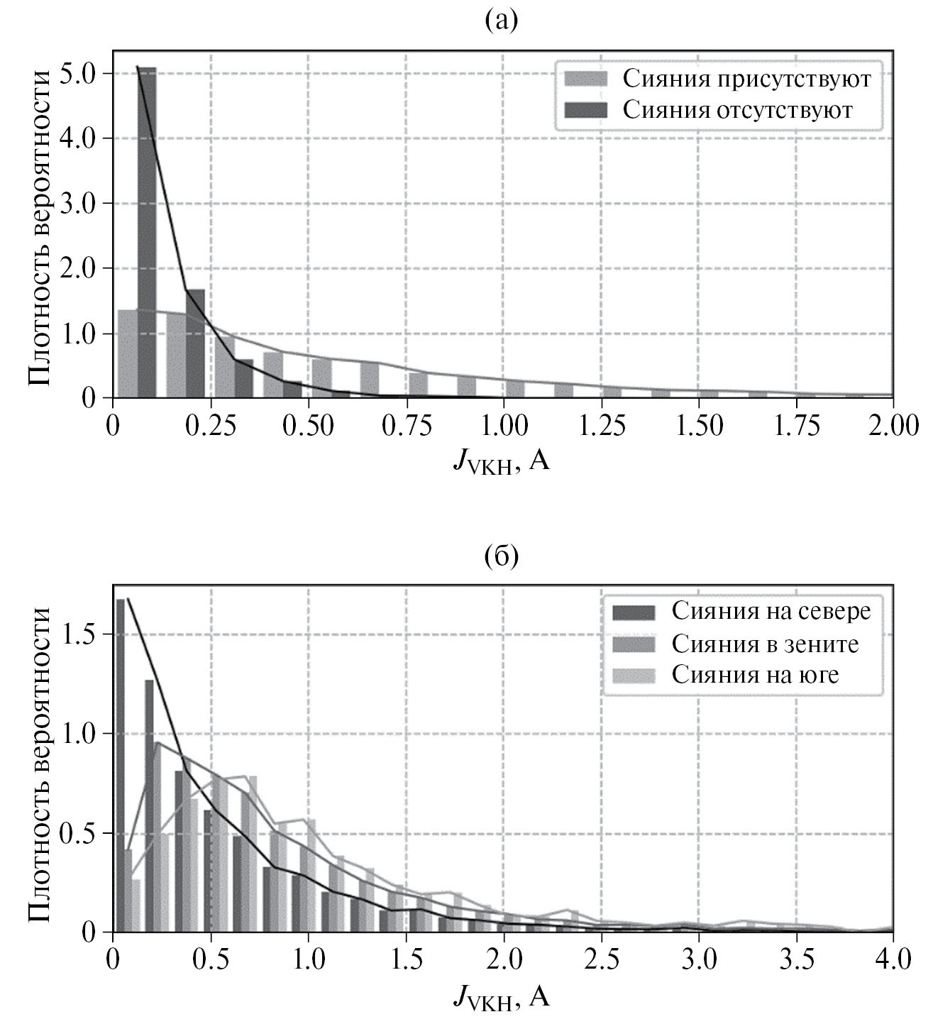 Рис. 5. Гистограмма распределения плотности вероятности значений ГИТ при наличии/отсутствии полярных сияний (а) и при их дифференциации по областям небосвода (б). Ширина интервалов гистограммы в данном случае определяется согласно правилу: hₙ = 3.49sn–1/3, где n – размер выборки, s – среднеквадратическое отклонение [Scott, 1979] и соответствует ∼0.15 А.