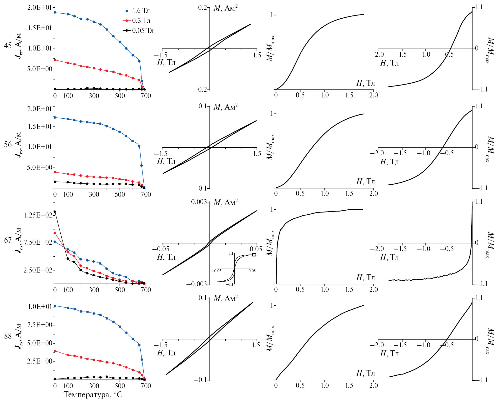 Для теста Лаури образцы последовательно намагничивались в трех перпендикулярных плоскостях с использованием импульсного намагничивающего устройства ASC IM-100 (ASC Scientific, США) в полях 1.6, 0.3 и 0.05 Тл. Последующее ступенчатое терморазмагничивание созданной изотермической намагниченности проводилось в установке TD-48 (ASC Scientific, США), а измерение образцов осуществлялось с помощью спин-магнитометра JR-6 (AGICO, Чехия). Лабораторные исследования петель гистерезиса и кривых нормального намагничивания были проведены в нарастающих полях от нуля до 1.5–1.8 Тл (на некоторых образцах до 0.05 Тл) на установке PMC MicroMag 3900 серии VSM (США).