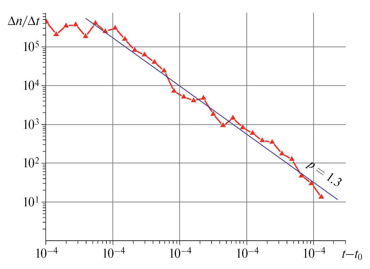 На рис. 5 представлена зависимость частоты афтершоковых событий от времени после главного события в модели ОФКЖ и показана аппроксимация в соответствии с законом Омори–Утсу (9). Вопрос о характере афтершоков симулируемых в модели ОФКЖ подробно рассмотрен в работе [Черепанцев, 2023]. Показано, что последовательность модельных афтершоковых событий подчиняется закону Омори–Утсу, если вклад роста “тектонических” напряжений значительно меньше вклада кинетики разрушения (что соответствует выбранным нами условиям (8)). Величины параметров p и c закона Омори–Утсу зависят от параметра взаимодействия α. С ростом α происходит уменьшение p и увеличение c.