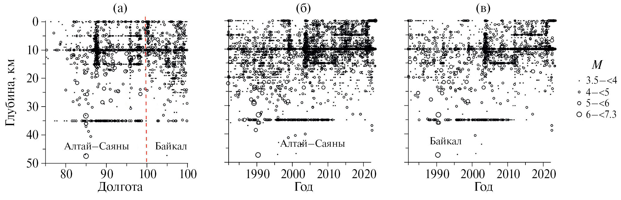 Рис. 2. Распределение глубин землетрясений Южной Сибири по долготе (а) и по годам (б), (в).
