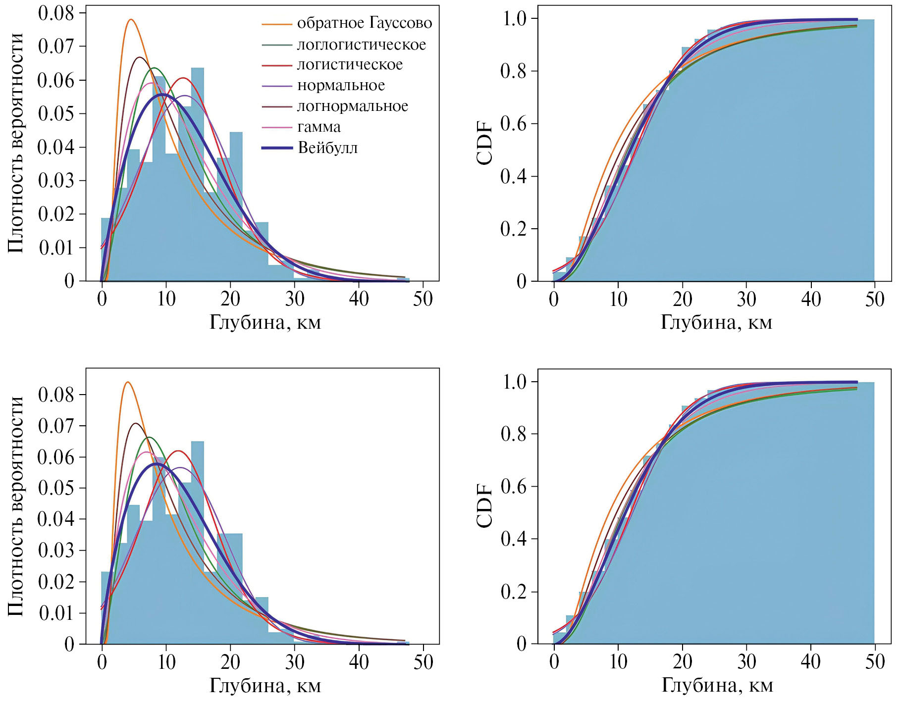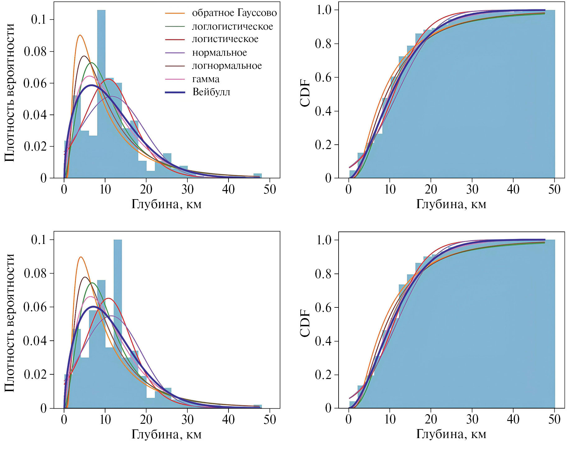 Рис. 4. Распределение глубин очагов землетрясений Байкальского рифта и варианты аппроксимации. Слева – дифференциальные распределения, справа – интегральные распределения и рассмотренные варианты аппроксимации. Снизу – по полному каталогу землетрясений, сверху – по каталогу основных толчков (афтершоки удалены). Варианты аппроксимации – усеченные распределения: обратное распределение Гаусса, логлогистическое распределение, логистическое распределение, нормальное распределение, логнормальное распределение, гамма-распределение, распределение Вейбулла.