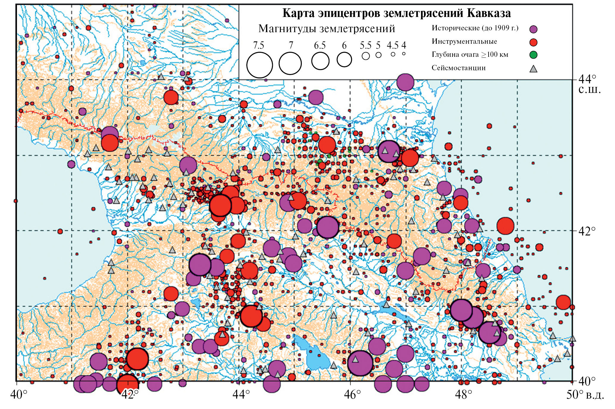 Рис. 4. Землетрясения Кавказа с М > 4.0 с древнейших времен по 2000 г. по работе [Годзиховская, 2000].