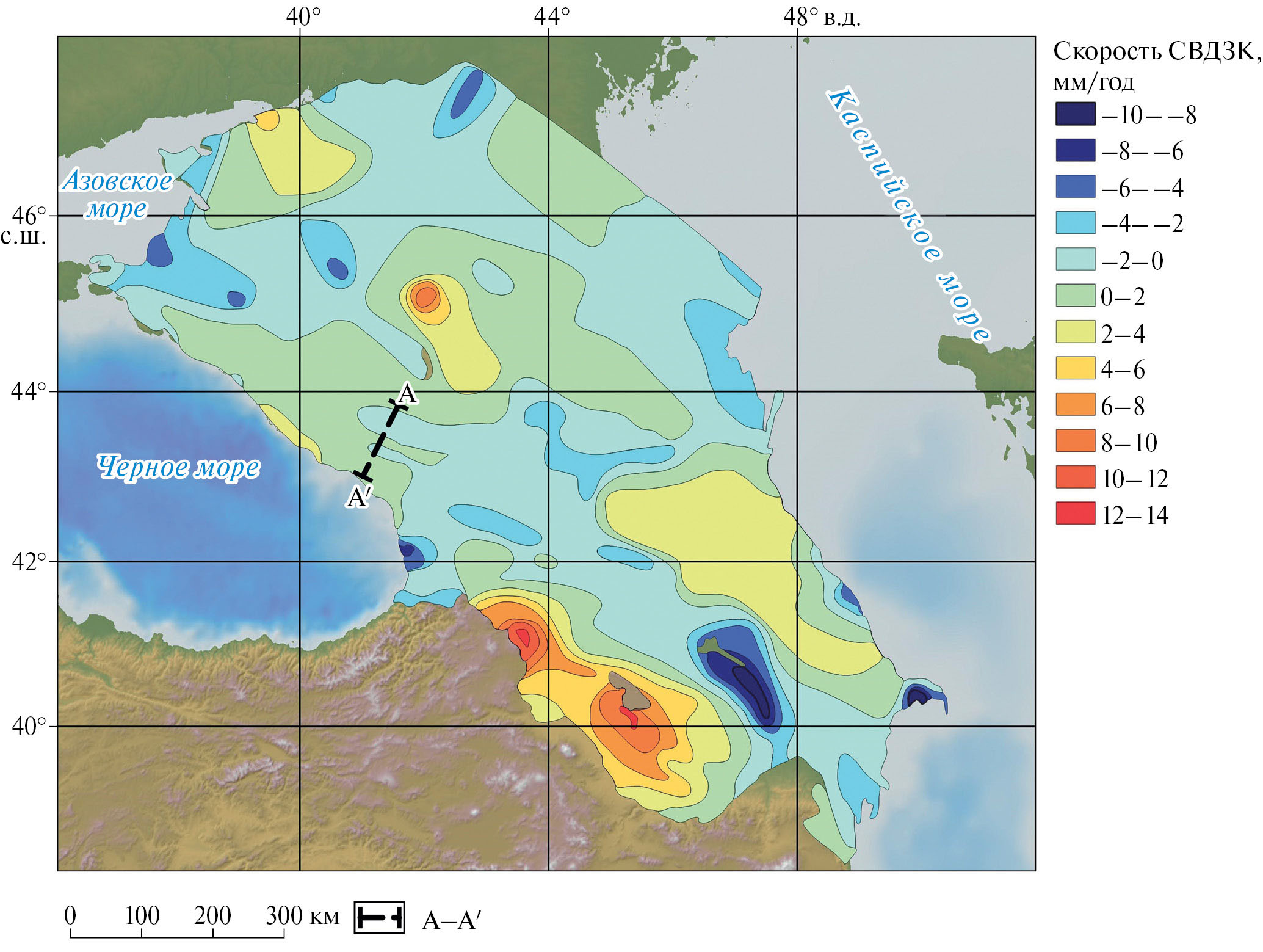 Рис. 11. Второй подъем Большого Кавказа (1970/75–1985/92 гг.) [Кафтан и др., 1995]. А–А′ – профиль геометрического нивелирования Зеленчук–Сухуми.