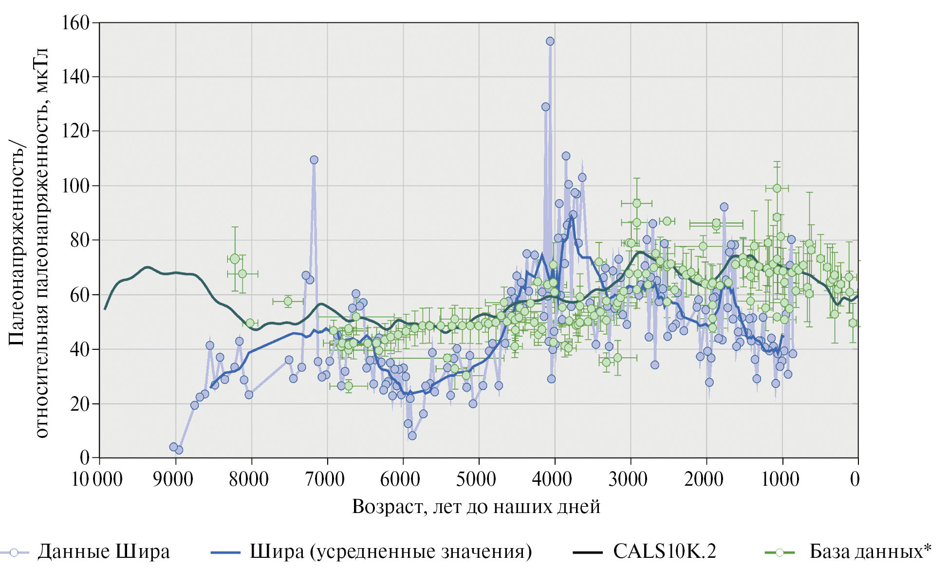 Хорошее согласие между различными моделями обосновано, очевидно, тем, что во всех моделях используется один и тот же набор данных, полученных непосредственно для региона вокруг оз. Шира. Как результат, указанные модели практически полностью повторяют археомагнитные данные по Сибири и Монголии, отобранные с территории, близкой к оз. Шира (координаты 46–57° с.ш. и 102–115° в.д.) [Бурлацкая, 1970; Бурлацкая и др., 1976; Начасова, Бураков, 1997a; 1997б; Бураков и др., 2000; Начасова, Бураков, 2008; Начасова и др., 2015] (рис. 10).
