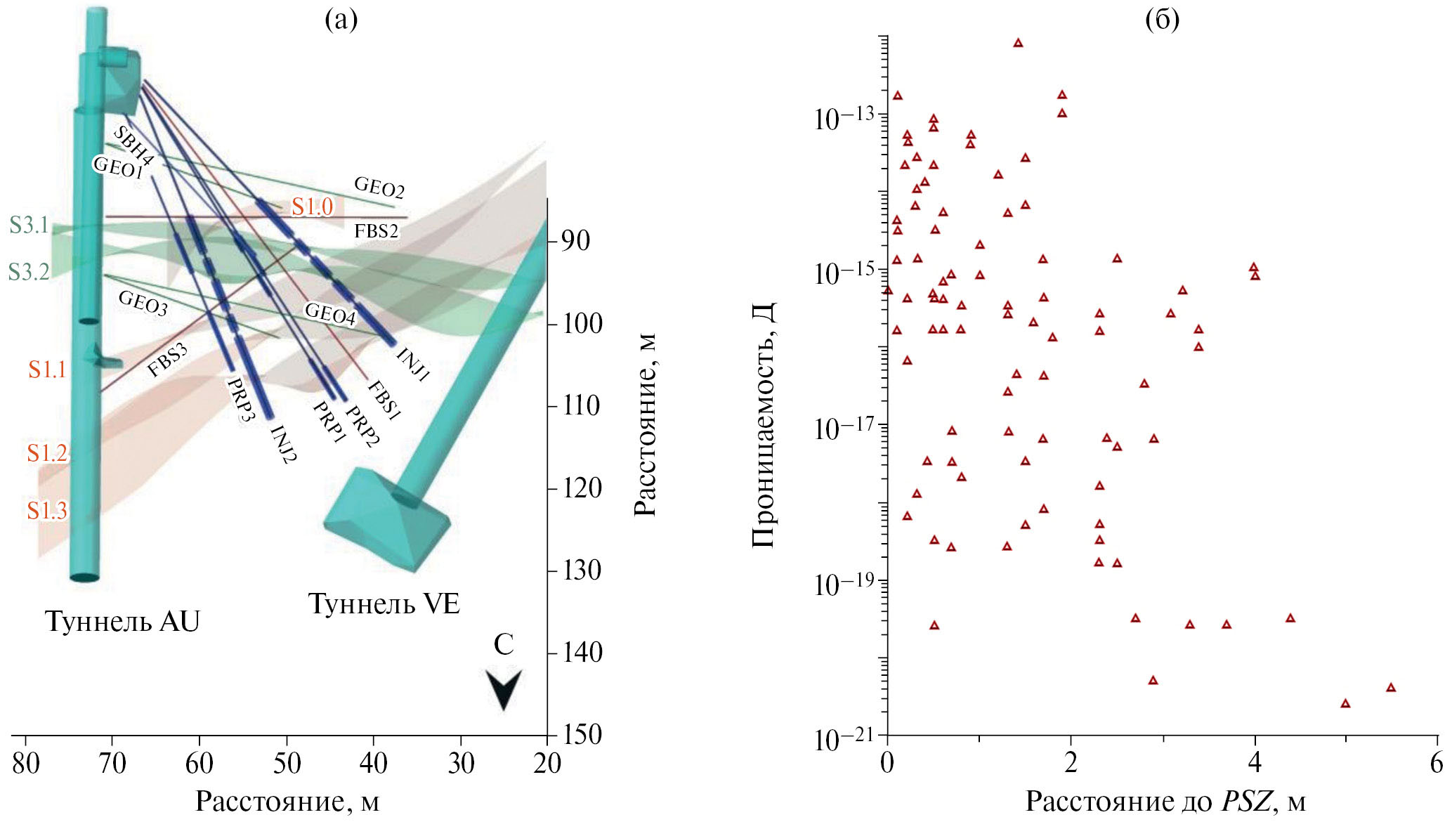Рис. 1. Схема проведения измерений на двух разломных зонах в Швейцарских Альпах и примеры полученных результатов (по данным работы [Brixel et al., 2020a]): (а) – вид сверху на участок проведения наблюдений; AU и VE – горизонтальные выработки; скважины INJ1, INJ2 и др., пробуренные из камеры в тоннеле AU, пересекали разломные зоны S1 и S3. Синими отрезками показаны участки нагнетания давления между пакерами; (б) – изменение проницаемости массива в зависимости от расстояния до PSZ разломов S1 и S3.