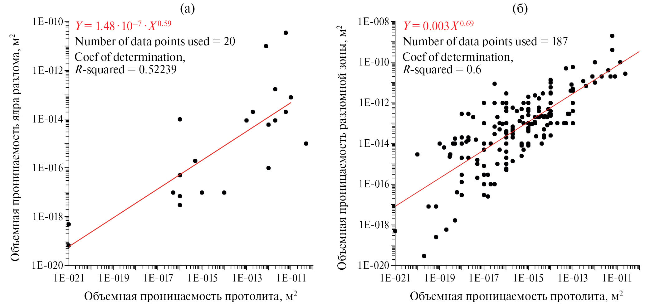 Рис. 3. Зависимость объемной проницаемости ядра разлома (а) и разломной зоны в целом (б) от объемной проницаемости вмещающей породы (по данным работы [Scibek, 2020]).