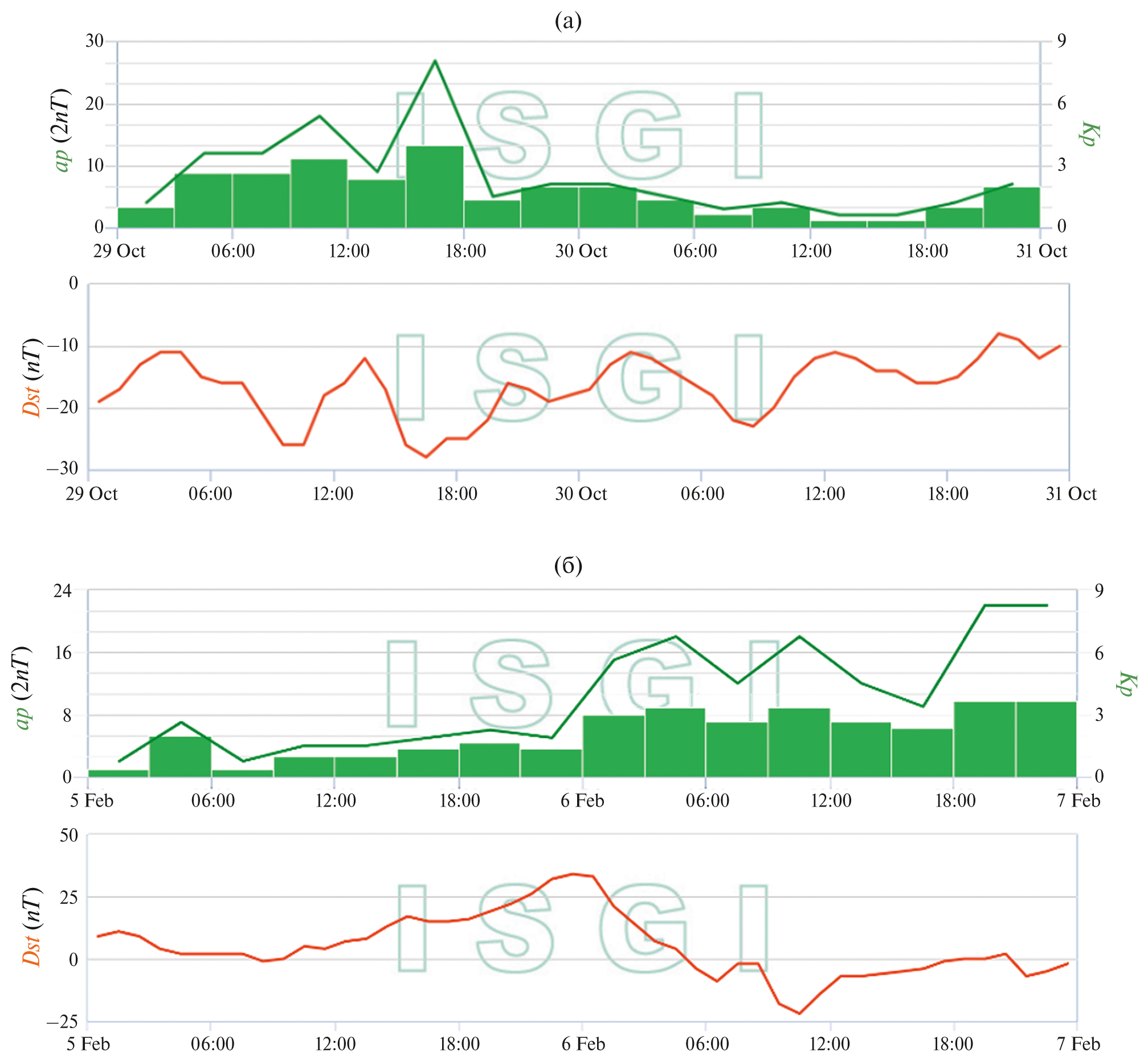 Рис. 3. Графики геомагнитных индексов Kp, ap (сверху) и Dst (снизу) за 29–30 октября 2020 г. (а) и 5–6 февраля 2023 г. (б).