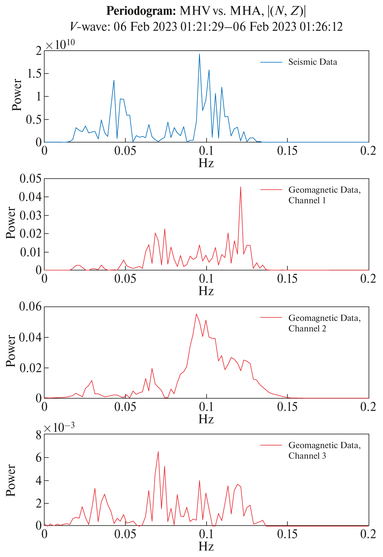 Для сопоставления частотного состава сейсмических и геомагнитных записей были построены периодограммы для каждого события на временном интервале существования геомагнитных возмущений. Использовались нормированные данные для сопоставимости спектральной плотности мощности разнородных наблюдений. При этом рассматривался 15-минутный отрезок с начала вступления P-волны, являющийся характерной продолжительностью всплеска dB/dt. Геомагнитный сигнал преимущественно занимает диапазон частот от 0.05 до 0.2 Гц; сейсмический сигнал тяготеет в область более низких частот (меньше 0.1 Гц). Примеры периодограмм, построенных по трем компонентам сейсмических колебаний и двум горизонтальным компонентам dB/dt, приведены на рис. 6.