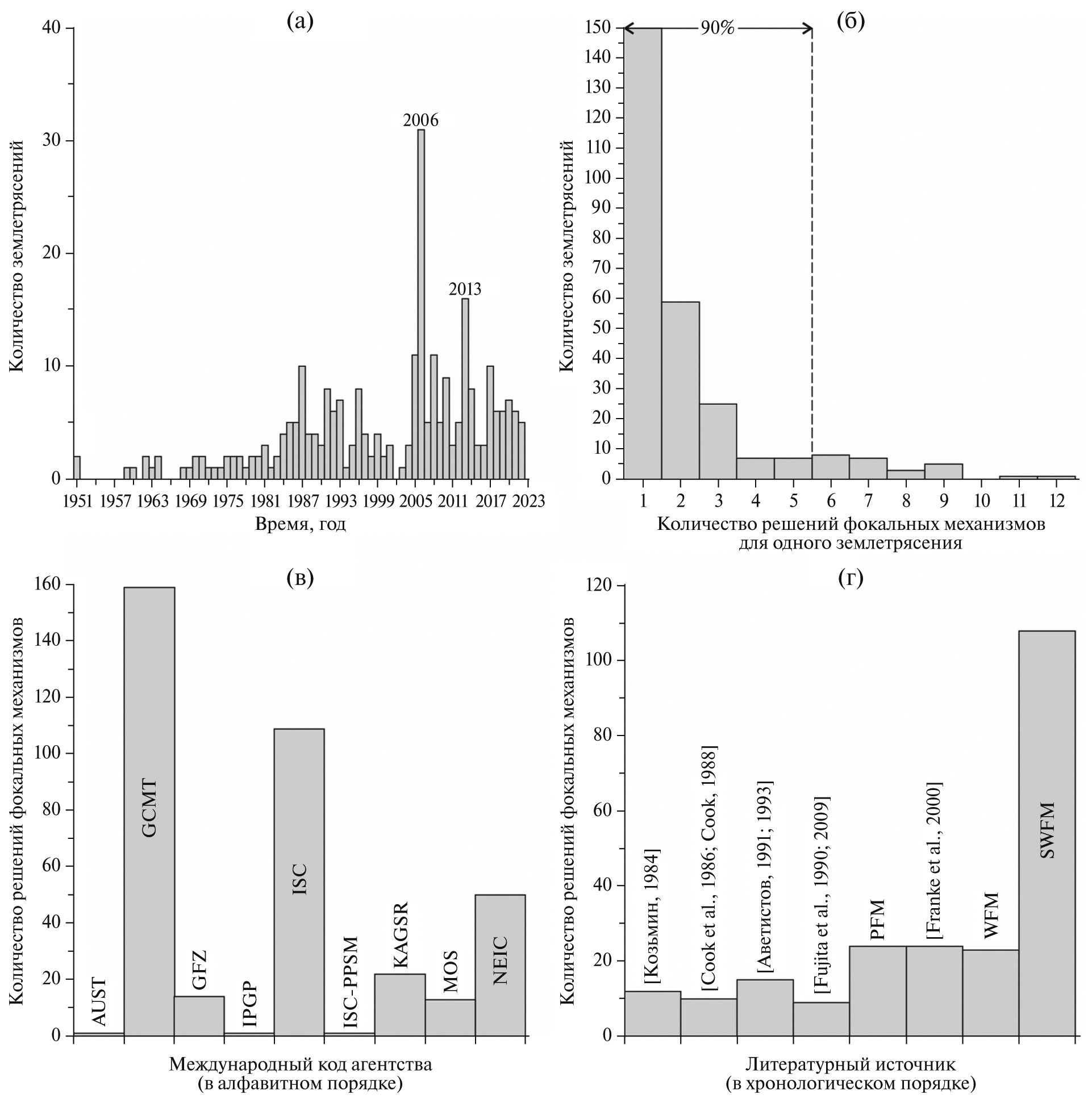 Рис. 4. Распределения количества землетрясений в базе данных по времени (а) и по количеству решений фокальных механизмов для одного землетрясения (б) и распределения количества решений фокальных механизмов по сейсмологическим агентствам (в) и литературным источникам (г). На панели (а) в распределение не включено Булунское землетрясение 14.11.1927 г. Расшифровка кодов агентств (в): AUST – Geoscience Australia, Australia (http://www.ga.gov.au); GCMT – The Global CMT Project, Lamont Doherty Earth Observatory, Columbia University, USA (https://www.globalcmt.org); GFZ – German Research Centre for Geosciences, Helmholtz Centre Potsdam, Germany (https://www.gfz-potsdam.de); IPGP – Institut de physique du globe de Paris, France (http://geoscope.ipgp.fr); ISC – Internarional Seismological Centre, UK (http://isc.ac.uk); ISC-PPSM – International Seismological Centre Probabilistic Point Source Model, UK (http://www.isc.ac.uk/projects/ProbabilisticSTF); KAGSR – Камчатский филиал ФИЦ “Единая геофизическая служба” РАН, г. Петропавловск-Камчатский, Россия (https://glob.emsd.ru); MOS – ФИЦ “Единая геофизическая служба” РАН, г. Обнинск, Россия (http://www.ceme.gsras.ru); NEIC – National Earthquake Information Center, USA (https://earthquake.usgs.gov). Для обозначения литературных источников введены следующие обозначения (г): PFM – [Балакина и др., 1972; Гунбина и др., 1988; Имаев и др., 1990; 1998; Имаева и др., 2015; Мишарина, 1967; Jemsek et al., 1986; Parfenov et al., 1988], WFM – [Fujita, 1995; McMullen, 1985; Olson, 1990; Riegel, 1994; Sloan et al., 2011], SWFM – [Имаева и др., 2017; 2021; Середкина, Козьмин, 2017; Фомочкина, Филиппова, 2023; Filippova, Melnikova, 2023; Seredkina, Melnikova, 2018].