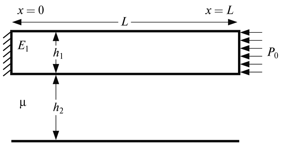 М. Ботт и Д. Дин использовали модель Эльзассера (1), (2) при исследовании миграции напряжений на границах литосферных плит и впервые ввели термин stress or strain waves [Bott, Dean, 1973]. Стандартными методами решалась задача по определению реакции упругой плиты конечной длины L на приложение давления P0 на одном конце плиты (рис. 2). Конец плиты при x = 0 считался фиксированным и представлял собой границу сжатия. Давление P0 мгновенно “включалось” на конце плиты x = L в момент времени t = 0. Уравнение (1) было решено при выбранных начальных: u = 0 при t = 0 (0 ≤ x < L) и граничных: u = 0 при x = 0 (t > 0) и , t > 0 условиях.