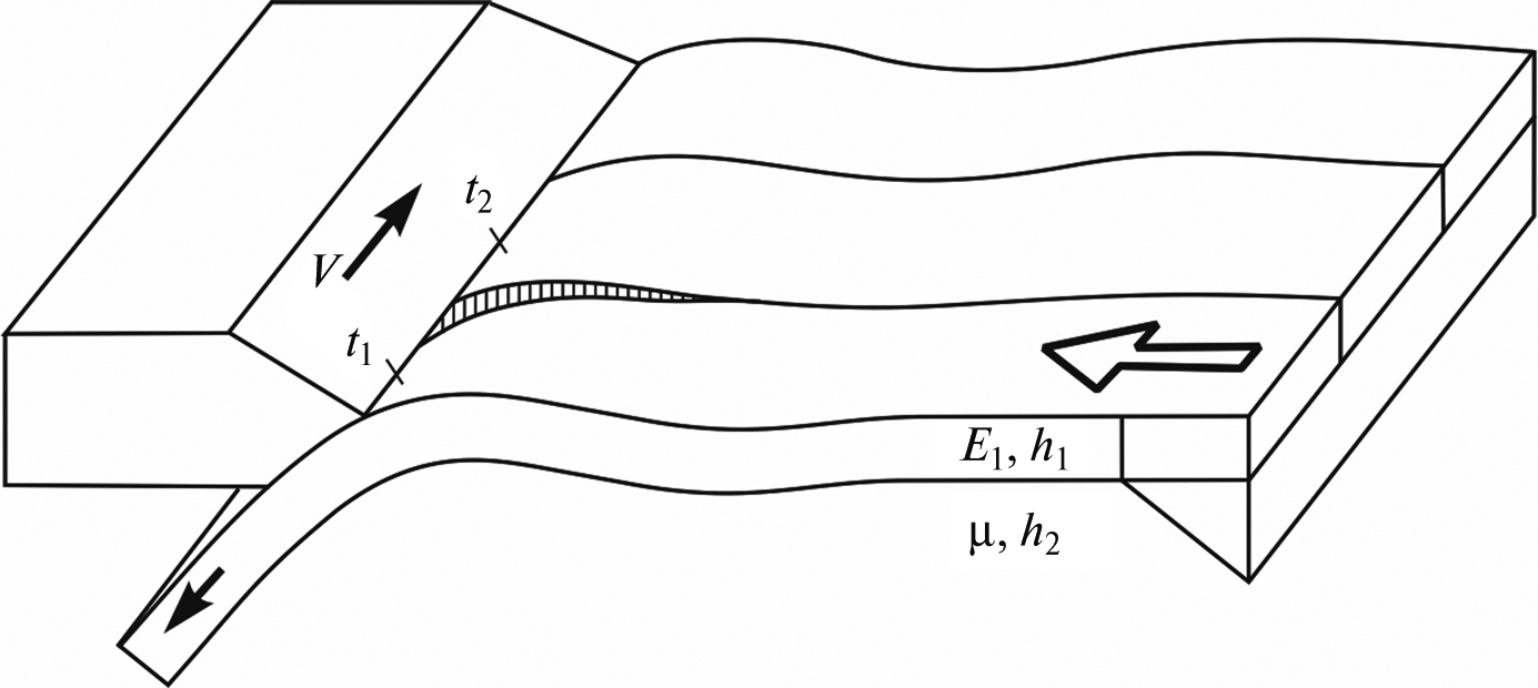 В 1967 г. американский физик Вальтер Эльзассер, ученик Макса Борна, впервые ввел представление о механизме передачи напряжений вдоль контакта литосфера–астеносфера [Elsasser, 1967]. Он предложил модель взаимодействия литосферы – твердой плиты мощностью h1 с модулем упругости E1 и астеносферы – подстилающего слоя “флюида” мощностью h2 с вязкостью µ (рис. 1). При устойчивом поступательном движении литосферы профиль линейного распределения скорости с глубиной имеет вид, показанный сплошной линией на рис. 1. Скорость vx скольжения литосферной плиты длиной L при горизонтальном напряжении σx вычисляется по формуле [Elsasser, 1969]. Исходя из предположения, что при движении плиты напряжение сдвига на нижней границе плиты уравновешивается общим горизонтальным напряжением на краю плиты, Эльзассер записал уравнение для осредненного по толщине плиты смещения u [Elsasser, 1969; 1971]: