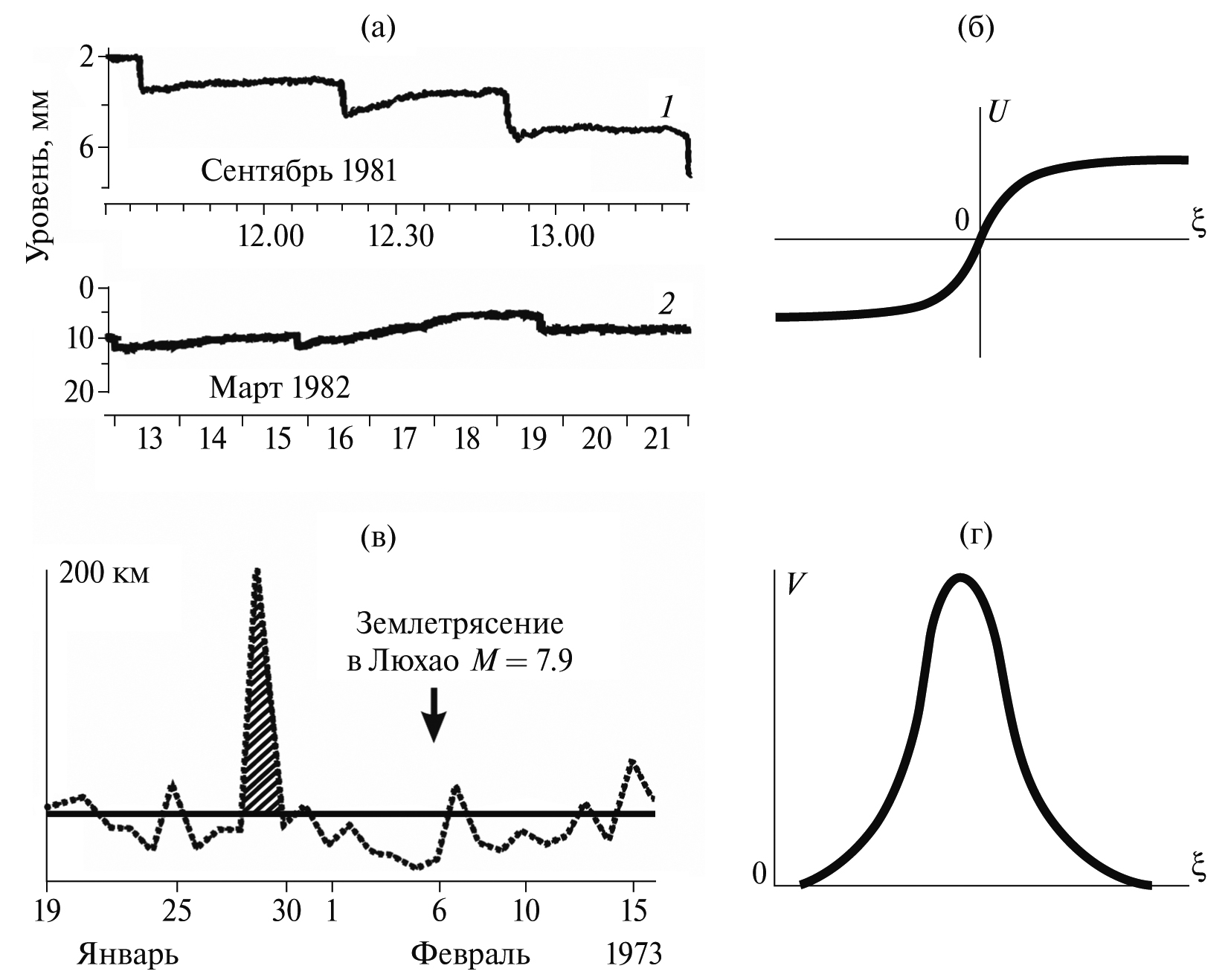 Рис. 7. Косвенные признаки деформационных волн вдоль разломов земной коры: (а) – ступенчатые колебания уровня воды в скважинах Ким (1) и Ашт (2) вблизи Ашхабада [Nikolaevskiy, 1998]; (б) – решение уравнения sin-Гордона U – кинк; (в) – концентрация радона, измеренная в Гузане перед землетрясением в Люхао [Nikolaevskiy, 1998]; (г) – решение уравнения sin-Гордона в виде солитона V (первая производная от функции U).