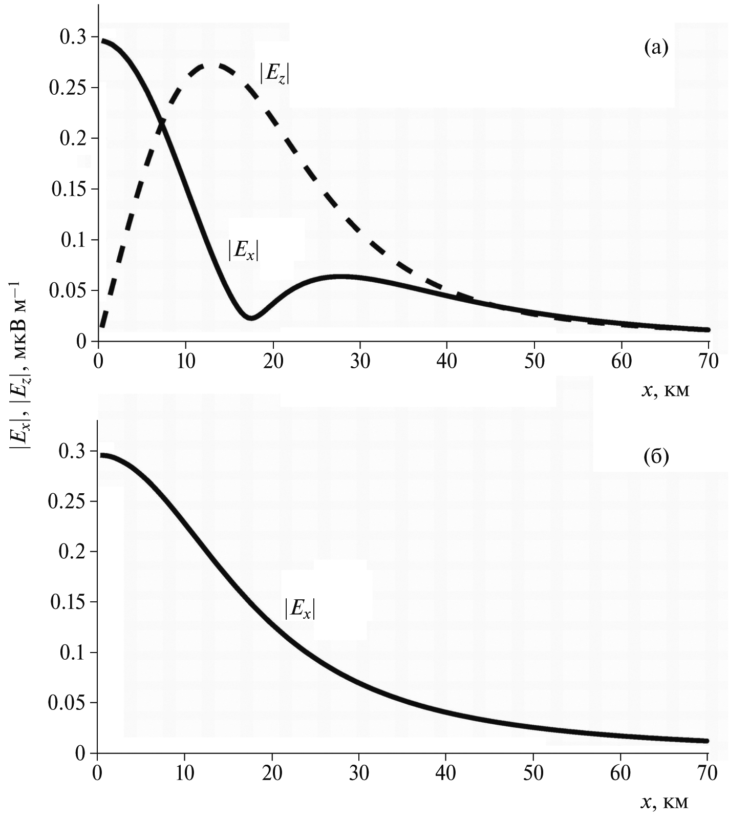 Пространственная структура амплитуд вертикальной |Ez (x, 0)| и горизонтальной |Ex (x, y)| компонент электрического поля на поверхности Земли показана на рис. 3. Вдоль тока (y = 0) из-за симметрии составляющая Ey = 0 и не показана (рис. 3а). Аналогично, не показаны компоненты Ey = Ez = 0 для направления поперек тока (x = 0). Максимальная величина горизонтальной компоненты достигает ∼ 0.3 мкВ/м над источником. Амплитуда компоненты |Ex (x, 0)| на больших расстояниях (x > 200 км) затухает по степенному закону ∝ x–3.