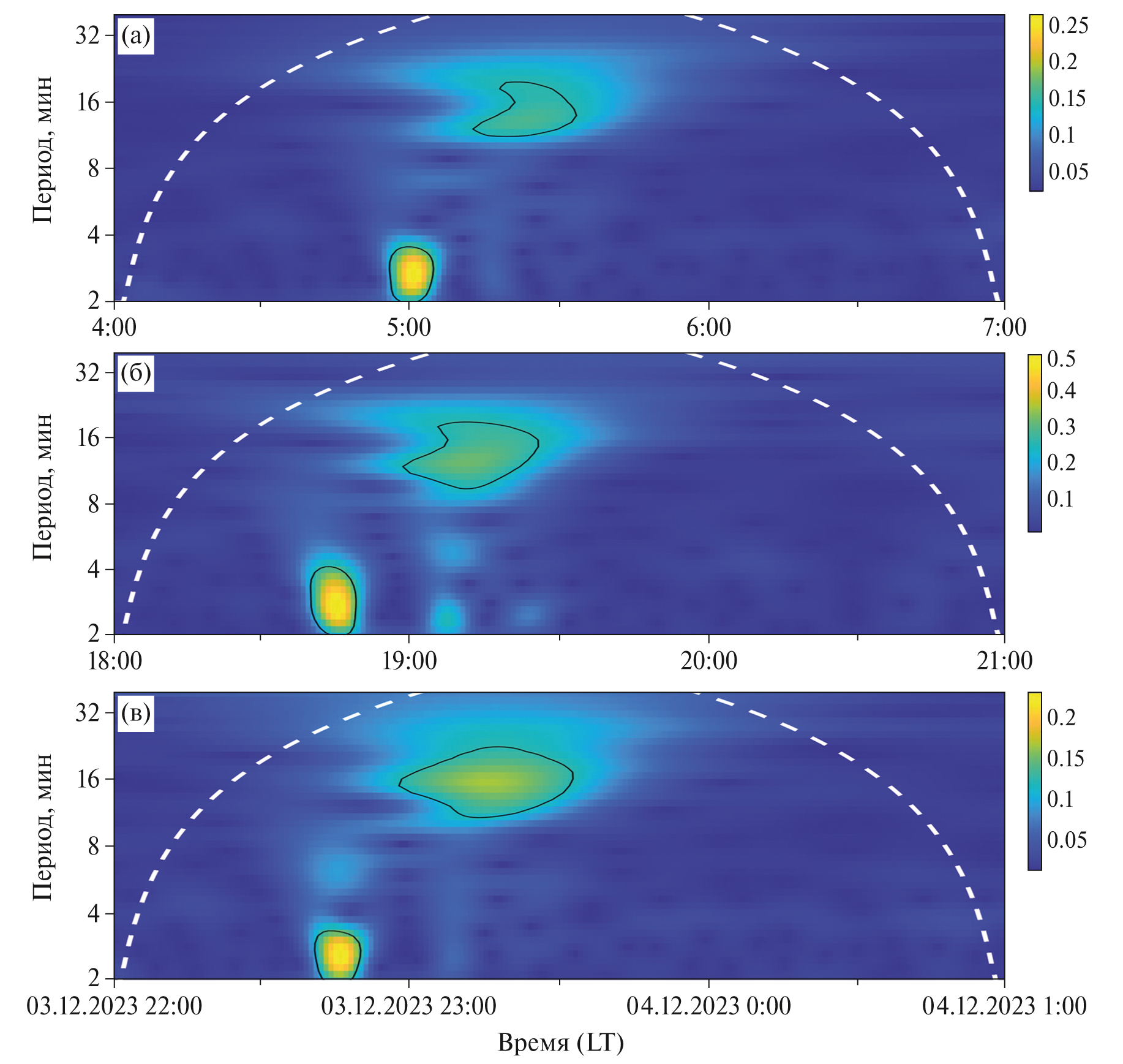 Рис. 3. Скалограммы геомагнитных вариаций (D-компонента) на станции Давао в период сильных афтершоков 03.12.2023 г. после мощного землетрясения c Mw = 7.4, произошедшего 02.12.2023 г.: (а) афтершок с Mw = 6 (4:52 LT); (б) афтершок Mw = 6.6 (18:35 LT); (в) афтершок Mw = 6 (22:35 LT).