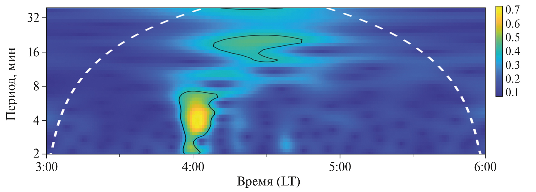 На рис. 2 представлена скалограмма вариаций D (восточно-западной) компоненты геомагнитного поля на станции Давао после основного толчка землетрясения и его трех афтершоков с магнитудой Мw = 6.4 (00:03 LT 03.12.2023 г.), Мw = 6.1 (1:40 LT 03.12.2023 г.) и Мw = 6.3 (2:09 LT 03.12.2023 г.). Как видно из рис. 2, скалограмма геомагнитных вариаций характеризуется рядом спектральных гармоник. Первая аномалия с периодом ∼ 3–6.5 мин появляется спустя ∼ 6 мин после основного толчка в 22:43 LT, а примерно через 19 мин после основного толчка в 22:56 LT наблюдается более длиннопериодная аномалия с периодом ∼ 10–19 мин. Продолжительность короткопериодной аномалии составляет ∼ 14 мин, а длиннопериодной аномалии – ∼ 48 мин. Спустя примерно 6 мин после сильного афтершока c Мw = 6.4 в 00:09 LT возникают колебания с периодом ∼ 2–4 мин, а еще через 10 мин после начала первой аномалии в 00:19 LT наблюдаются колебания с периодом ∼ 11–17 мин. Спустя примерно 6 мин после сильного афтершока c Мw = 6.1 в 1:46 LT возникают колебания с периодом ∼ 3.5–5 мин, а еще через 10 мин после начала первой аномалии в 1:56 LT наблюдаются колебания с периодом ∼ 9–16 мин. Спустя примерно 7 мин после сильного афтершока c Мw = 6.3 в 2:16 LT возникают колебания с периодом ∼ 3–4 мин, а еще через 10 мин после начала первой аномалии в 2:30 LT наблюдаются колебания с периодом ∼ 10–19 мин. Продолжительность короткопериодной аномалии после афтершока c Мw = 6.4 составляет ∼ 9 мин, после афтершока c Мw = 6.1 составляет ∼ 8 мин, после афтершока c Мw = 6.3 составляет ∼ 10 мин, а длительности длиннопериодных аномалий после этих афтершоков равны ∼ 24 мин, ∼ 28 мин и ∼ 40 мин соответственно. В скалограмме, представленной на рис. 2, присутствуют еще две аномалии с периодами ∼ 2.5–3.5 мин и ∼ 16–18 мин, возникающие примерно через 7 мин (2:02 LT) и 21 мин (2:16 LT) после афтершока c Мw = 5.9 (03.12.2023 г., 1:55 LT, 8,64 с.ш., 126,97 в.д., 76 км севернее города Хинатуана в провинции Суригао-дель-Сур, 251 км).