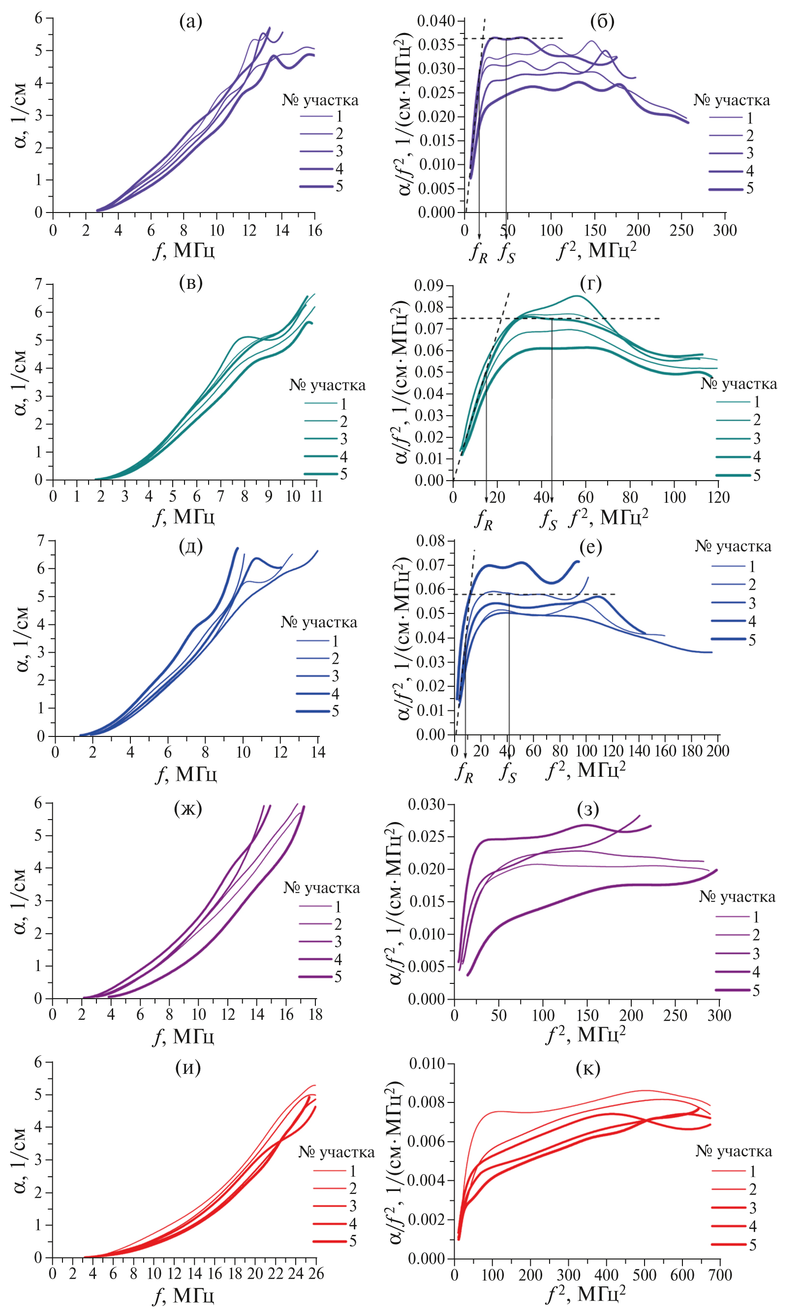 Рис. 4. Частотные зависимости коэффициента затухания продольных ультразвуковых волн α (f) (а), (в), (д), (ж), (и) и эти же зависимости в координатах α / f2 (f2) (б), (г), (е), (з), (к) для исследованных образцов метапесчаников: (а), (б) – ЛВ2140; (в), (г) – ЛВ2093; (д), (е) – ЛВ2138; (ж), (з) – ЛВ1312; (и), (к) – ЛВ1356.