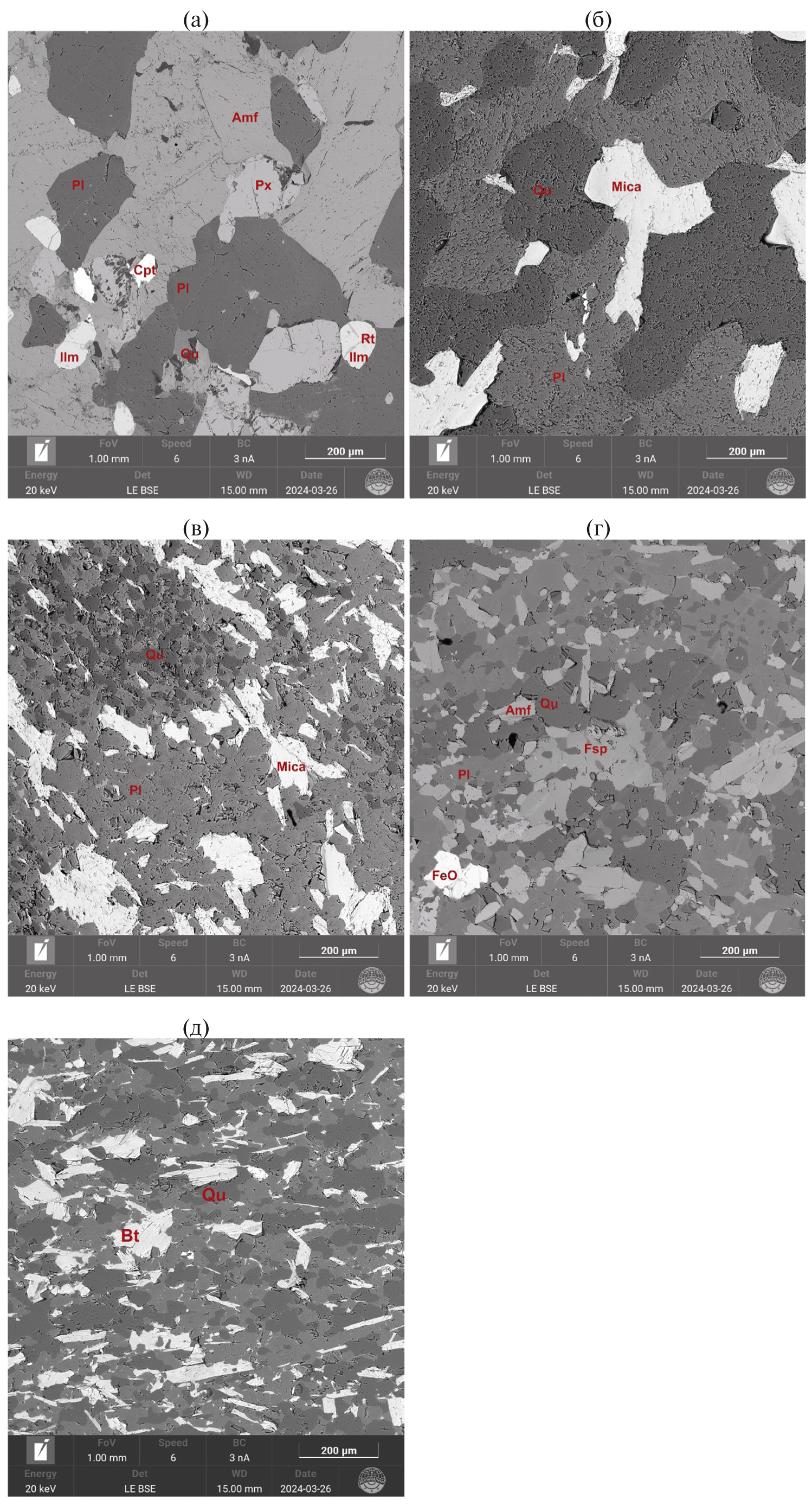 Рис. 5. Примеры СЭМ-изображений аншлифов исследованных образцов метапесчаников: (а) ЛВ2140, (б) ЛВ2093, (в) ЛВ2138, (г) ЛВ1312, (д) ЛВ1356. Cpx – клинопироксен, Amph – амфибол, Pl – плагиоклаз, Qu – кварц, Kfs – калишпат, Mica – слюда, Bt – биотит, Ilm – ильменит, Rt – рутил, Chp – халькопирит.
