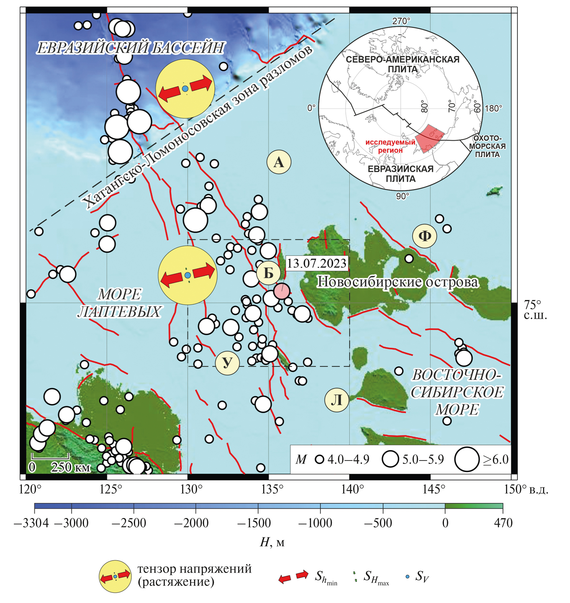 Шельф моря Лаптевых представляет собой континентальную окраину Северной Евразии. Он отделен от Евразийского бассейна Хатангско-Ломоносовской разломной зоной, сдвиговые смещения по которой прекратились в раннем кайнозое [Шипилов и др., 2021] (рис. 1). На шельфе развита система рифтовых впадин, разделенных поднятиями (горстами) [Драчев, 2000; Имаева и др., 2017; Drachev, Scharubo, 2017]. Рассматриваемое сейсмическое событие приурочено к одной из таких впадин – Бельковско-Святоносскому рифту. По данным морского многоканального сейсмопрофилирования МОВ ОГТ северный субмеридиональный сегмент этого рифта имеет ширину 20–30 км, а в районе 75° N и 136° E, т.е. вблизи эпицентра землетрясения 13.07.2023 г., его направление изменяется на юго-восточное [Драчев, 2000]. Еще южнее – вблизи о. Столбовой – его ширина достигает 50 км, а сам рифт состоит из двух полуграбенов, разделенных горстом. По оценкам авторов работ [Драчев, 2000; Gaina et al., 2002] в целом процессы растяжения на шельфе моря Лаптевых начались в позднем мелу в связи с раскрытием Евразийского бассейна. Они продолжаются до настоящего времени, что подтверждается результатами многочисленных реконструкций напряженно-деформированного состояния литосферы различных масштабных уровней, основанных на данных о механизмах очагов региональных землетрясений (например, см. рис. 1) [Имаева и др., 2017; Filippova, Melnikova, 2023; Heidbach et al., 2018; Imaeva et al., 2017; Seredkina, Melnikova, 2018].