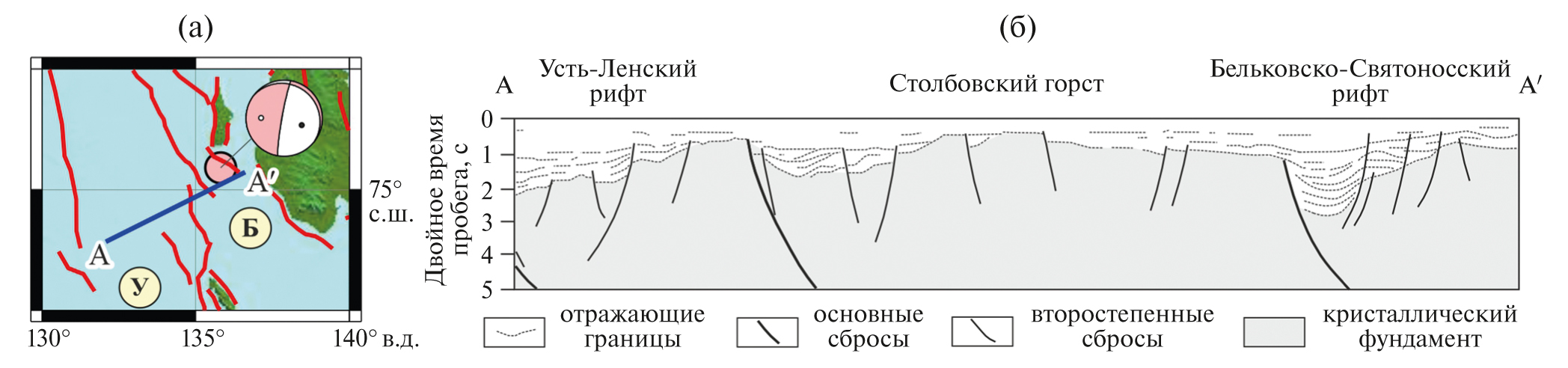 Рис. 7. Положение (а) и северо-восточный фрагмент интерпретированного профиля МОВ ОГТ ЛАРГЕ 89010 (б) согласно работам [Драчев, 2000; Drachev et al., 1998] c упрощениями. AA′ (синяя линяя) – северо-восточная часть профиля ЛАРГЕ 89010, красные линии – активные разломы по работе [Zelenin et al., 2022]. Обозначения рифтов (буквы в кружках) см. в подписи к рис. 1. На панели (а) показано выбранное нами в качестве наиболее предпочтительного решение фокального механизма землетрясения 13.07.2023 г. в проекции нижней полусферы (№ 1 для T = 50–120 c на рис. 4).