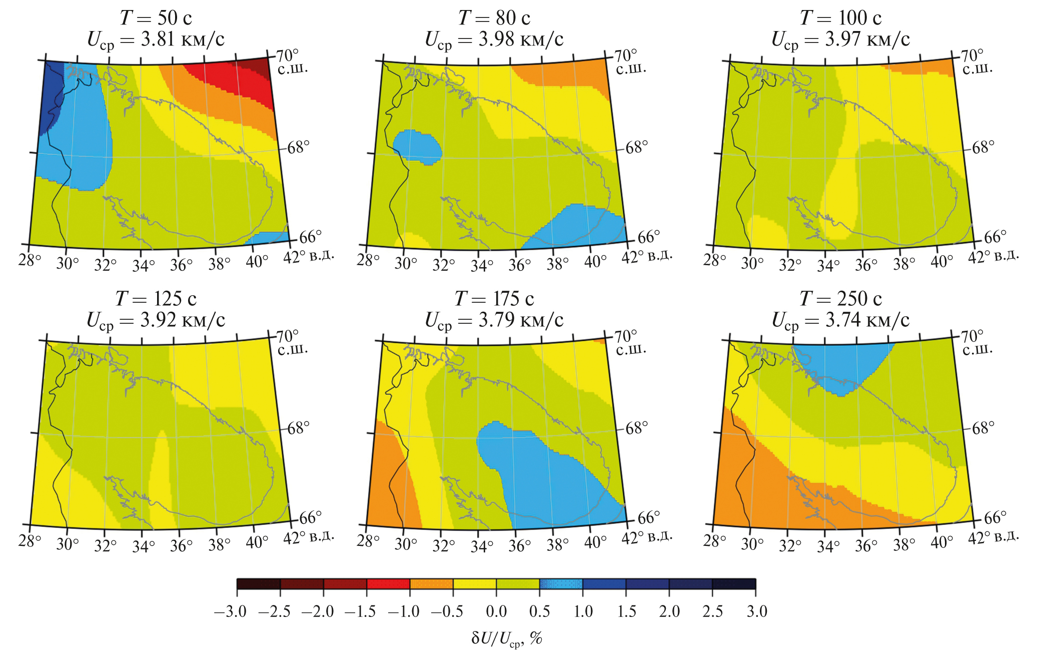 Многочисленные глобальные поверхностно-волновые модели, например, широко используемая в мире модель (см. работу [Schaeffer, Lebedev, 2013]), как и результаты региональных поверхностно-волновых реконструкций [Levshin et al., 2001; 2007; Lebedev et al., 2017; Seredkina, 2019], для Кольского региона имеют довольно сглаженное горизонтальное разрешение. Несколько лучшей разрешающей способностью характеризуются результаты работы [Филиппова, Соловей, 2022] (см. далее). Однако в ней строятся лишь распределения групповых скоростей поверхностных волн на отдельных периодах, что затрудняет привязку выявленных скоростных неоднородностей к конкретным глубинам.