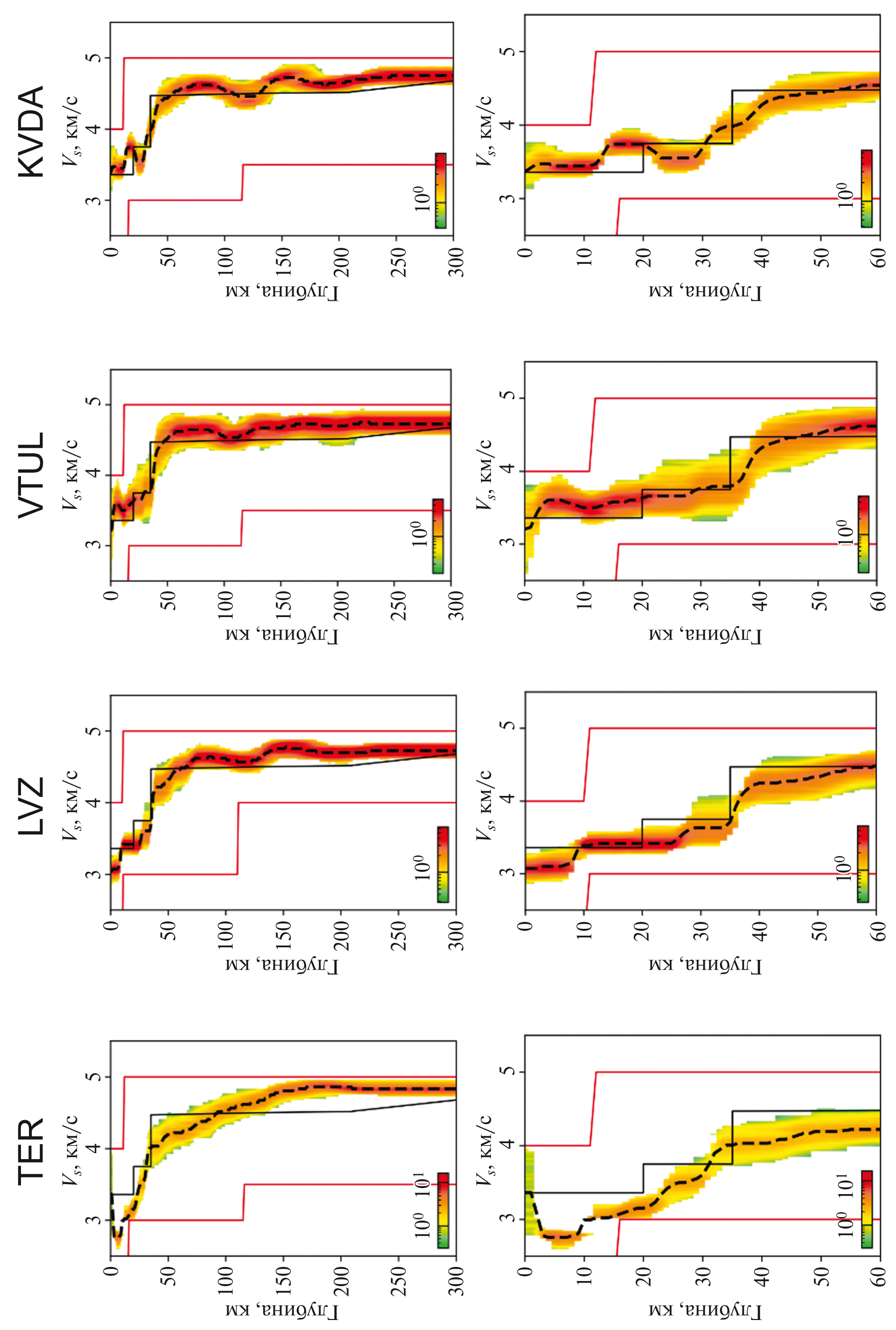 Восстановление скоростных разрезов выполнено методом, описанным в работе [Алешин, 2021]. Кратко процедура инверсии выглядит так – было сгенерировано по 100 000 случайных пробных моделей для каждой станции, каждая из этих моделей служила начальным приближением в процедуре оптимизации по алгоритму Левенберга–Марквардта [Press et al., 2007]. Из совокупности полученных в результате минимизации моделей отбирались те, которые описывали наблюдения с заданной точностью. Окончательная выборка составила порядка 1% от всего набора моделей. Совокупность медианных значений определяемых параметров на заданной глубине для всего диапазона глубин рассматривалась как искомая скоростная модель.