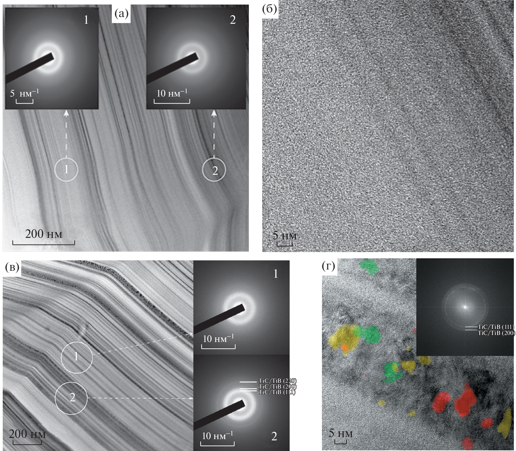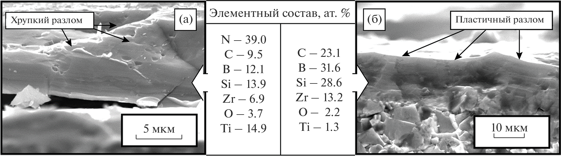 Zr–B–Si–C–Ti and Zr–B–Si–C–Ti–N coatings have been produced for the first time by an arc physical vapor deposition process in a residual argon + nitrogen atmosphere. The Zr–B–Si–C–Ti coating had an amorphous–nanocrystalline structure. Nanocrystallites were formed in the Ti–B–C system, and the amorphous component of the material was formed by Zr–B–C and Si–C phases. The coating of the latter system had a predominantly amorphous structure (amorphous content of ~85–93%) based on titanium nitride with Ti–B and Ti–C bonds, zirconium carboboronitride (Zrx(C,N,B)y), zirconium boride, and silicon carbonitride.