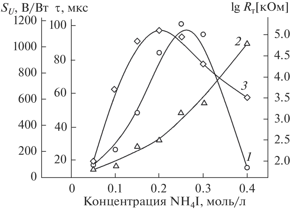 ). Increasing the inhibitor concentration in solution leads to an increase in the lattice parameter of the lead sulfide from 0.59315(1) to 0.59442(3) nm, due to iodine substitution for sulfur in the PbS crystal lattice. The spectral sensitivity peak and the long-wavelength edge of the photoresponse of the PbS films shift to shorter wavelengths from 2.5 to 2.2 and from 3.0 to 2.8 μm, respectively, which is attributable to the formation of the wide-band-gap phase PbI2. Using low-temperature measurements, the thermal band gap of the films grown in the presence of 0.15 and 0.25 mol/L NH4I has been determined to be 0.46 and 0.51 eV. The respective activation energies for acceptor impurity levels are 0.135 and 0.153 eV. The iodine-doped PbS films offer a relatively high voltage responsivity in the IR spectral region owing to an n- to p-type conversion, in combination with an anomalously short response time.