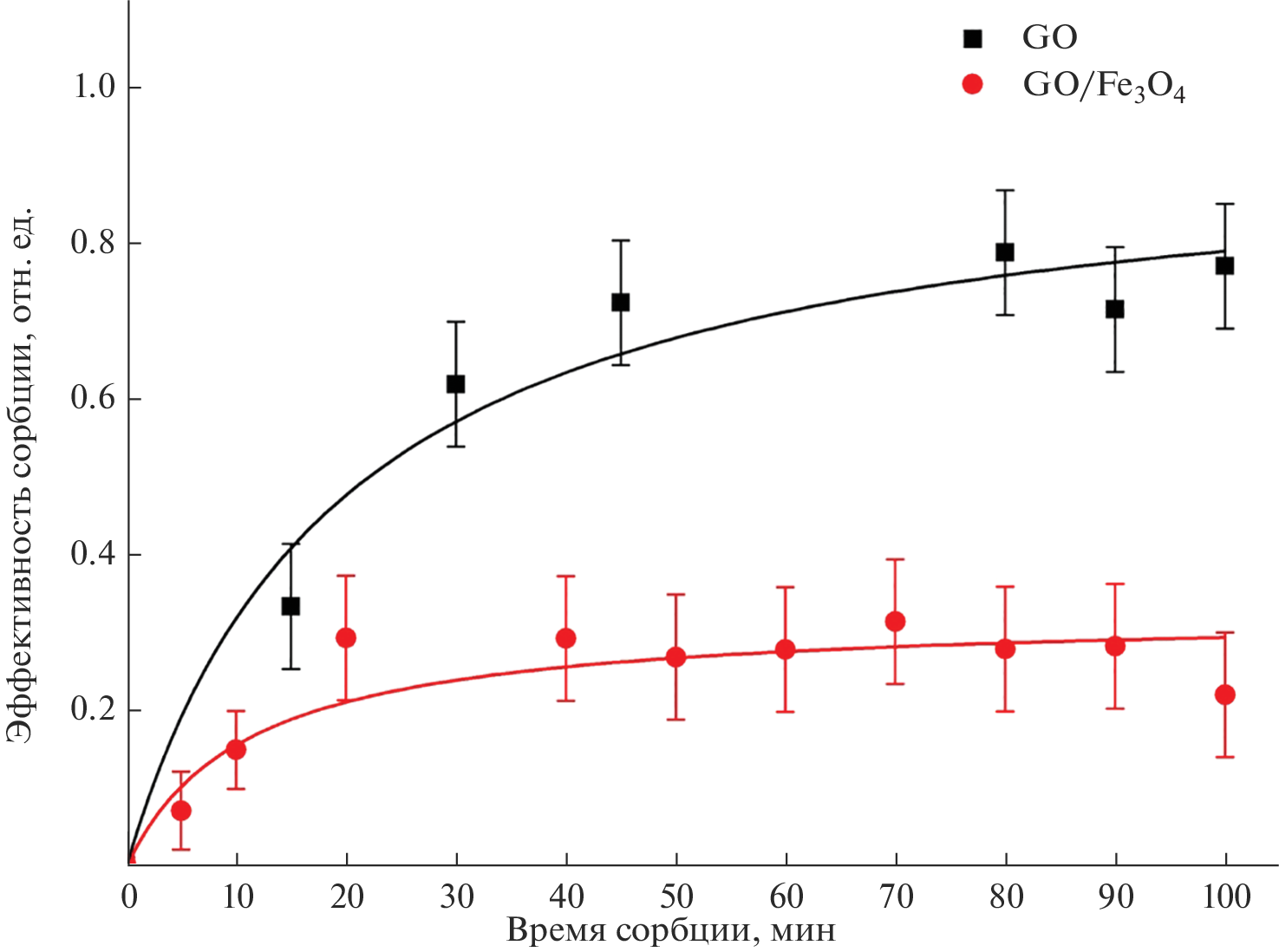 В статье рассматриваются новые методики получения аэрогелей на основе оксида графита (GO) и его нанокомпозитов с суперпарамагнитными наночастицами оксидов железа (GO/Fe3O4), а также обсуждаются особенности полученных материалов в качестве сорбентов доксорубицина из водных растворов. Установлено, что эффективность сорбции аэрогелем на основе GO и суперпарамагнитных наночастиц оксида железа (GO/Fe3O4) и аэрогелем GO составляет около 50 и 85% соответственно. В то же время, к преимуществам магнитного аэрогеля следует отнести возможность извлечения сорбента при помощи внешнего магнитного поля. Показано, что при формальном описании сорбции уравнением кинетики псевдопервого порядка: \(W(\tau ) = W(\infty )\left( {1 - {{{\text{e}}}^{{ - k\tau }}}} \right),\) где W – эффективность сорбции, константы достигают значений k = 0.042 ± 0.004 мин–1 для оксида графита и 0.0832 ± 0.018 мин–1 для нанокомпозита GO/Fe3O4. Для композита GO/Fe3O4 насыщение наступает примерно в 2 раза быстрее, чем для чистого GO, а процесс сорбции магнитным аэрогелем является экзотермическим, максимальная эффективность сорбции из раствора с концентрацией 40 мг/л при 25°C составила 95%, при 40°C – 60%. Полученные результаты перспективны для использования магнитных графитовых аэрогелей в качестве сорбентов и матриц для терапевтических противоопухолевых препаратов пролонгированного действия.