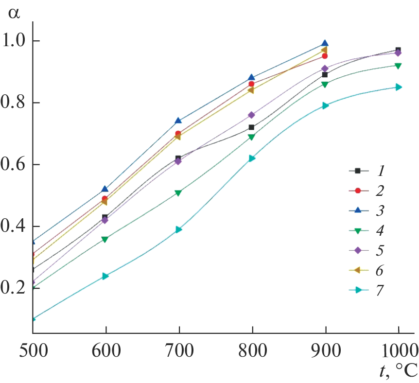 Синтезирована алюмомагнезиальная шпинель с использованием золь–гель-метода. Изучено влияние оксидов европия и иттрия на синтез и кинетику формирования алюмомагнезиальной шпинели при термической обработке в интервале температур 500–1000°C. Методами рентгенофазового и химического анализов установлено, что формирование алюмомагнезиальной шпинели происходит при температуре 1000°C и выдержке 240 мин ксерогеля, полученного на основе смеси соединений Al(NO3)3 + Mg(NO3)2 при соотношении 2 : 1 соответственно. Полученный продукт содержит примесь несвязанного MgO. Добавка минерализующего оксида Eu2O3 в количестве 1.5 мас. % от общей массы исходной смеси при выдержке 240 мин снижает температуру максимального формирования шпинели до 900°C. В случае Y2O3 для максимального формирования шпинели при этой же температуре требуется добавка в количестве 3 мас. %.