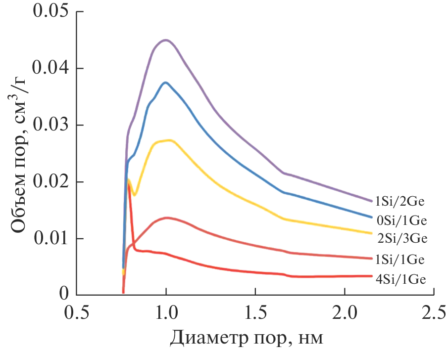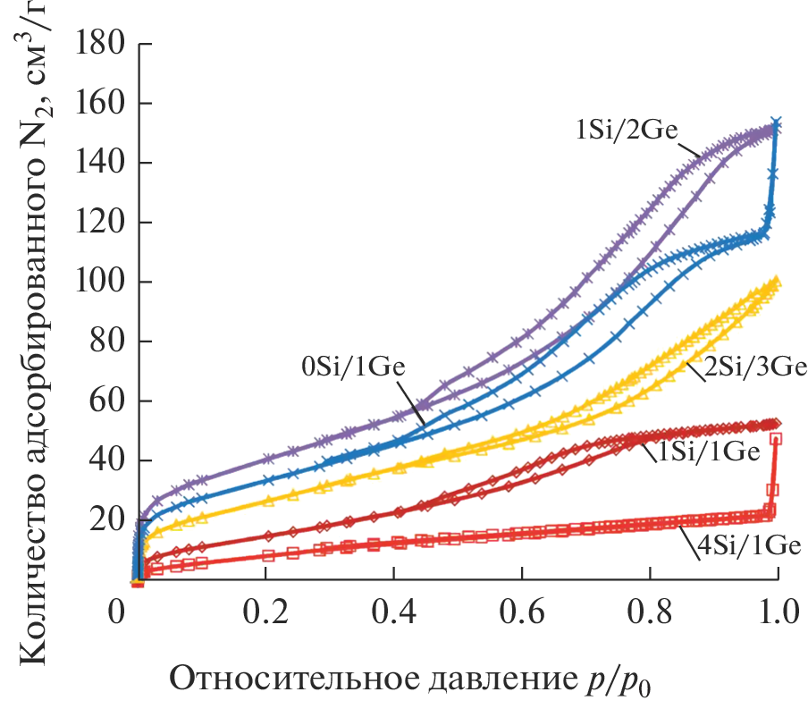 Properties of porous materials prepared from glasses of the Na2O–B2O3–SiO2–GeO2 system have been studied using low-temperature nitrogen adsorption/desorption measurements. The results demonstrate that germanium substitution for silicon in the glasses studied leads to an increase in pore volume at SiO2/GeO2 ratios of down to 0.5. The porous glass with this composition has the largest specific surface area and micro- and mesopore volumes. We assume that the observed changes in the porosity parameters of glass in the case of complete germanium substitution for silicon are related to structural features of the borogermanate glass network, associated with B–O–B bond breaking and the formation of non-bridging oxygen atoms.