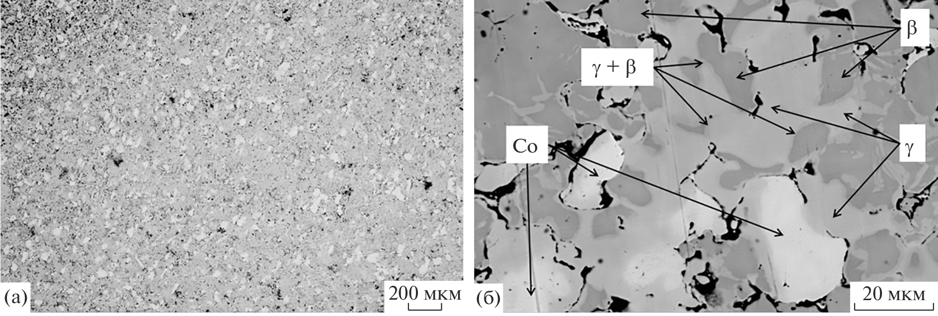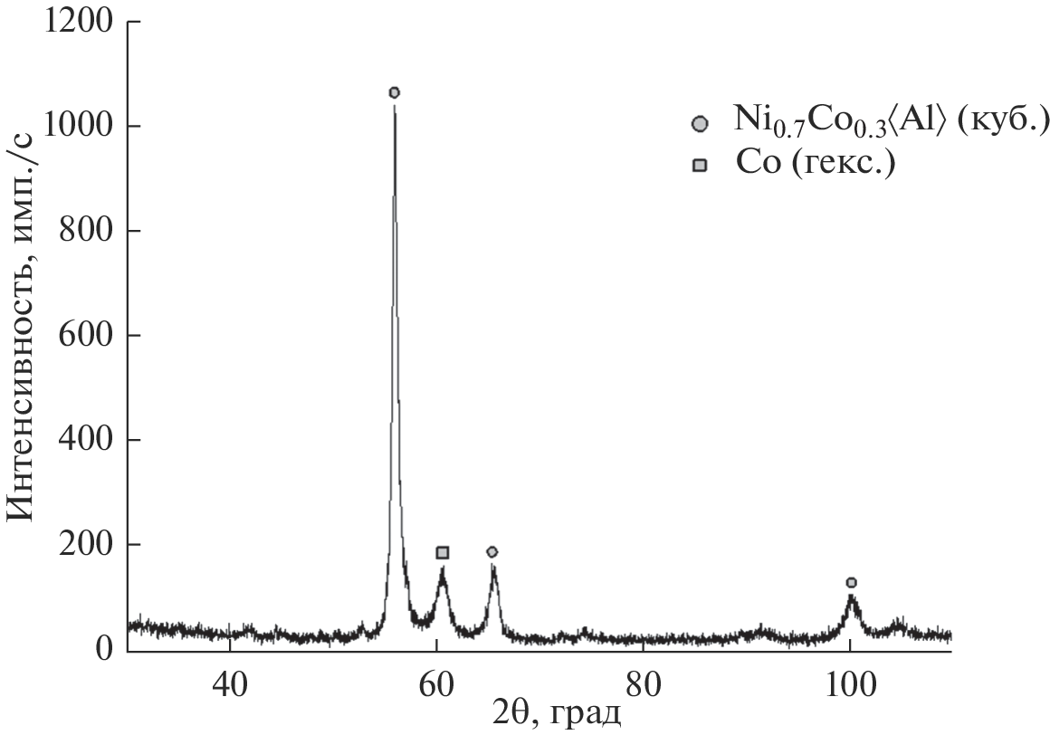 В работе исследованы особенности структуро- и фазообразования сплава на основе системы Ni–Al–Co, полученного методом СВС. Максимальная температура горения в аргоне составила 1020°C, а в вакууме – 913°C. Фазовый состав синтезированного сплава представлен твердым раствором Ni0.7Co0.3\(\left\langle {{\text{Al}}} \right\rangle \) с кубической решеткой Pm\(\bar {3}\)m. Структурные составляющие сплава на основе γ-, β-фаз имеют размер 10–20 мкм, прослойки γ + β, расположенные на границе γ- и β-фаз, достигают 1–2 мкм. Сплав проявляет высокую пластичность, прочность на сжатие составляет 451 МПа. Низкий остаточный магнетизм, величина коэрцитивной силы и высокая намагниченность показывают, что этот сплав относится к магнитомягким материалам. Коэрцитивная сила составляет Hc = 146 Э. Остаточная намагниченность σr = 0.35 эмe/г, намагниченность насыщения σs = 36.76 эме/г.