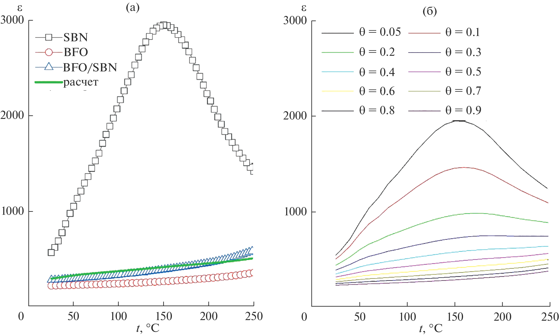 Using rf cathode sputtering in an oxygen atmosphere, we produced a heterostructure based on the bismuth ferrite (BFO) multiferroic and barium strontium niobate (SBN) ferroelectric: BiFeO3(1000 nm)/Sr0.5Ba0.5Nb2O6(1000 nm)/Pt(001)/MgO(001). It was free of impurity phases and had a root mean square surface roughness within 1% of its thickness. All of the layers in the heterostructure were grown epitaxially. The SBN-50 layer consisted of orientation domains tilted in the plane of the interface by ±18.4° with respect to the MgO substrate axes, and the crystallographic axes of the BFO and Pt layers were parallel to the substrate axes. The ferroelectric polarization of the material at U = 90 V was shown to be 59.3 μC/cm2. Our results demonstrate that, to describe the behavior of the relative dielectric permittivity (ε) of the heterostructure in the range 25–250°C, it is sufficient to take into account the ε(t) data for each layer. The mechanisms underlying the observed effects are discussed.