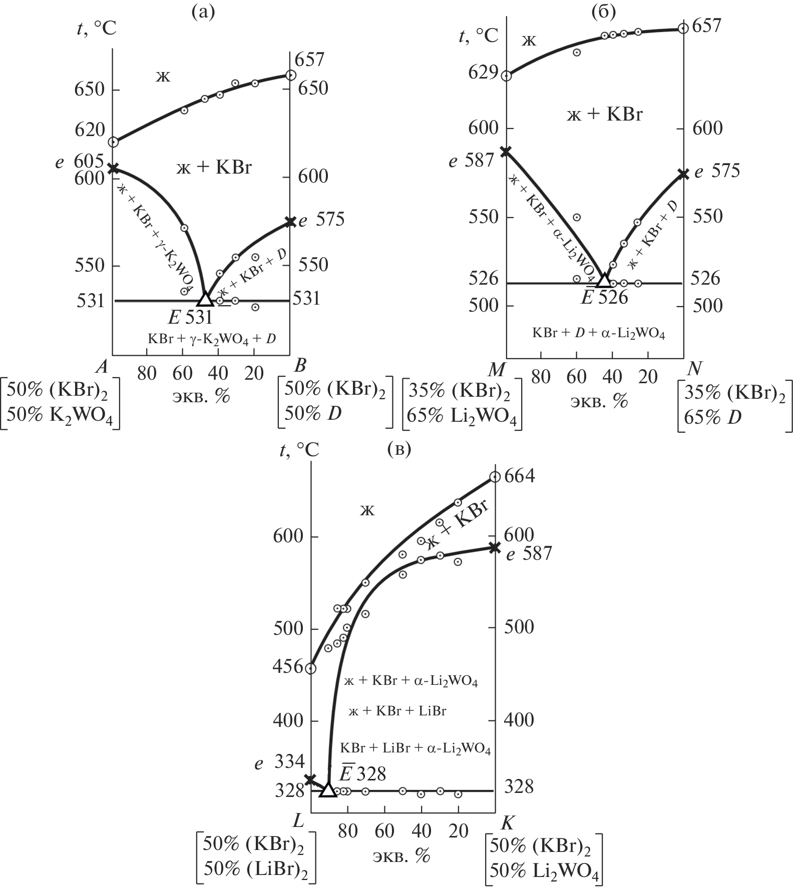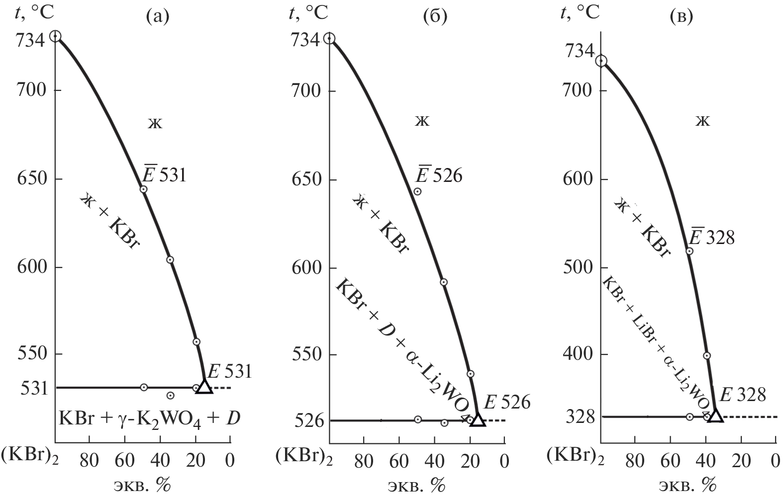 We have studied the ternary reciprocal system Li+, K+ || Br–, ". A likely phase compatibility diagram of the system has been chosen using thermodynamic calculations of the enthalpy and Gibbs energy of exchange reactions and confirmed by differential thermal analysis data for the stable joins KBr–Li2WO4 and KBr–Li2WO4∙K2WO4. The stable joins have been shown to be pseudobinary systems, and their T–x phase diagrams have been mapped out. We have constructed a phase tree of the system, which has a linear structure and includes three stable triangles (LiBr–KBr–Li2WO4, KBr–Li2WO4–Li2WO4∙K2WO4, and KBr–Li2WO4∙K2WO4–K2WO4) connected to each other by two stable joins. To find ternary eutectic mixtures in the stable triangles, T–x phase diagrams for a number of sections have been constructed. We have measured the specific enthalpy of fusion of the pseudobinary and ternary eutectics. The ternary mixture with the lowest melting point in the Li+, K+ || Br–, @ system, 328°C, has the highest specific enthalpy of fusion: 200 kJ/kg.