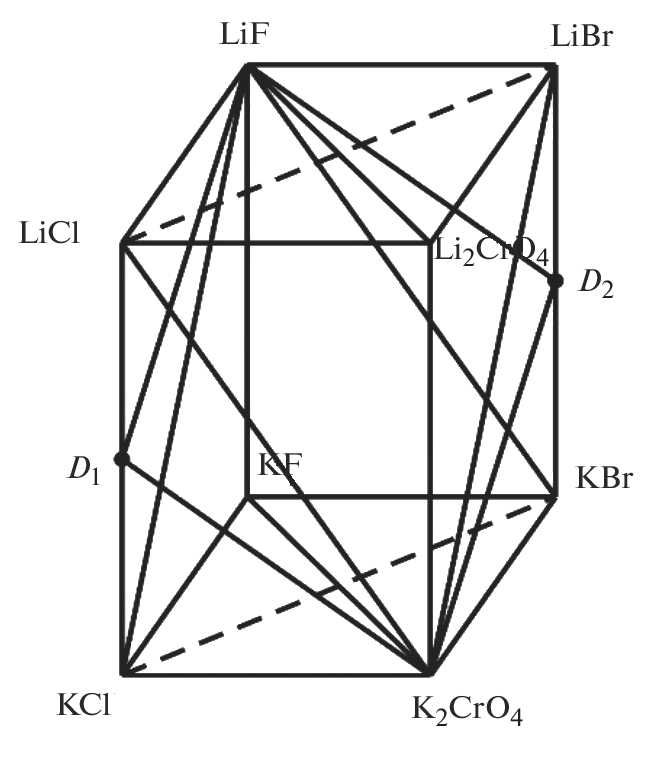 has been divided into simplexes using graph theory: by making up an adjacency matrix and solving a logical expression. The results have been used to construct the phase tree of the system, which has a linear structure and consists of four stable secant tetrahedra, four stable pentatopes, and one stable hexatope. The number and composition of phases crystallizing in the system have been predicted. The LiF–KCl–KBr–Li2CrO4 stable tetrahedron has been studied using differential thermal analysis and X-ray diffraction. The tetrahedron has no invariant equilibrium points. The continuous series of solid solutions between potassium chloride and potassium bromide has been shown to be stable, without decomposition. Three solid phases have been shown to crystallize in the tetrahedron: LiF, Li2CrO4, and KClxBr1–x.