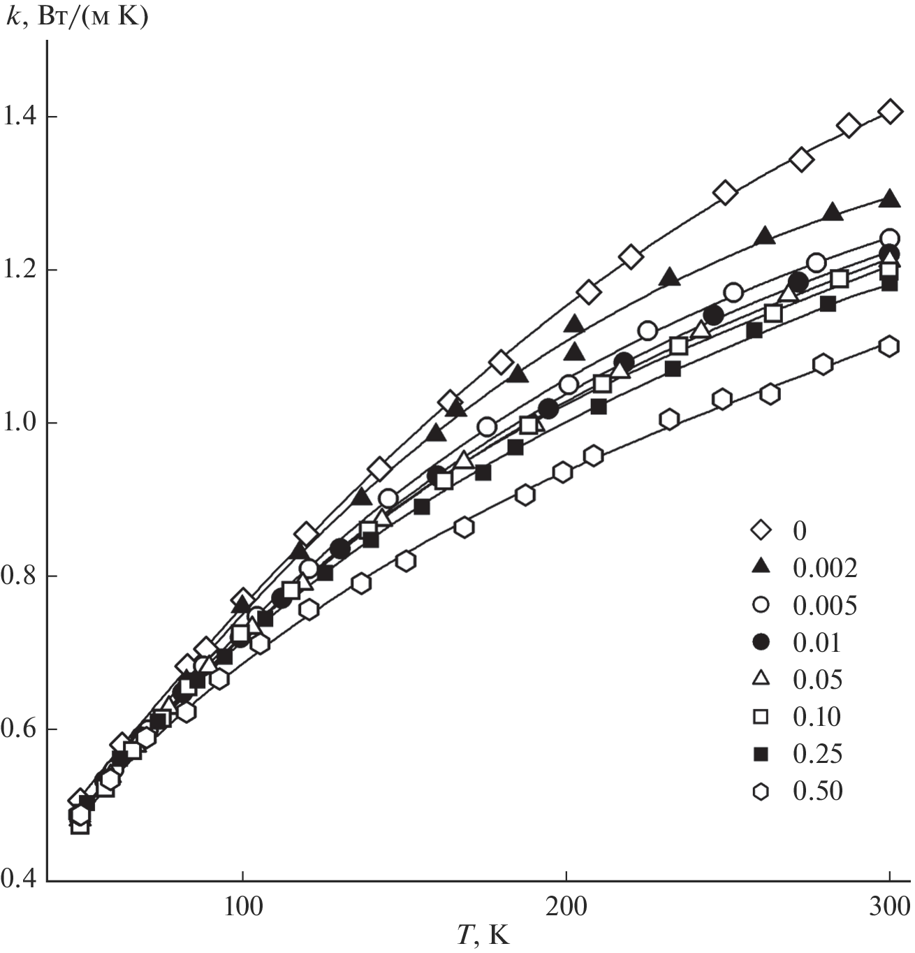 The thermal conductivity k of a series of single crystals of Na0.4(Y1 – xNdx)0.6F2.2 (x = 0–0.5) solid solutions has been measured in the range 50–300 K by an absolute steady-state axial heat flow technique. The temperature behavior of thermal conductivity for all of the crystals is characteristic of disordered materials. The room-temperature thermal conductivity of the solid solutions is low: k = 1.1–1.4 W/(m K).