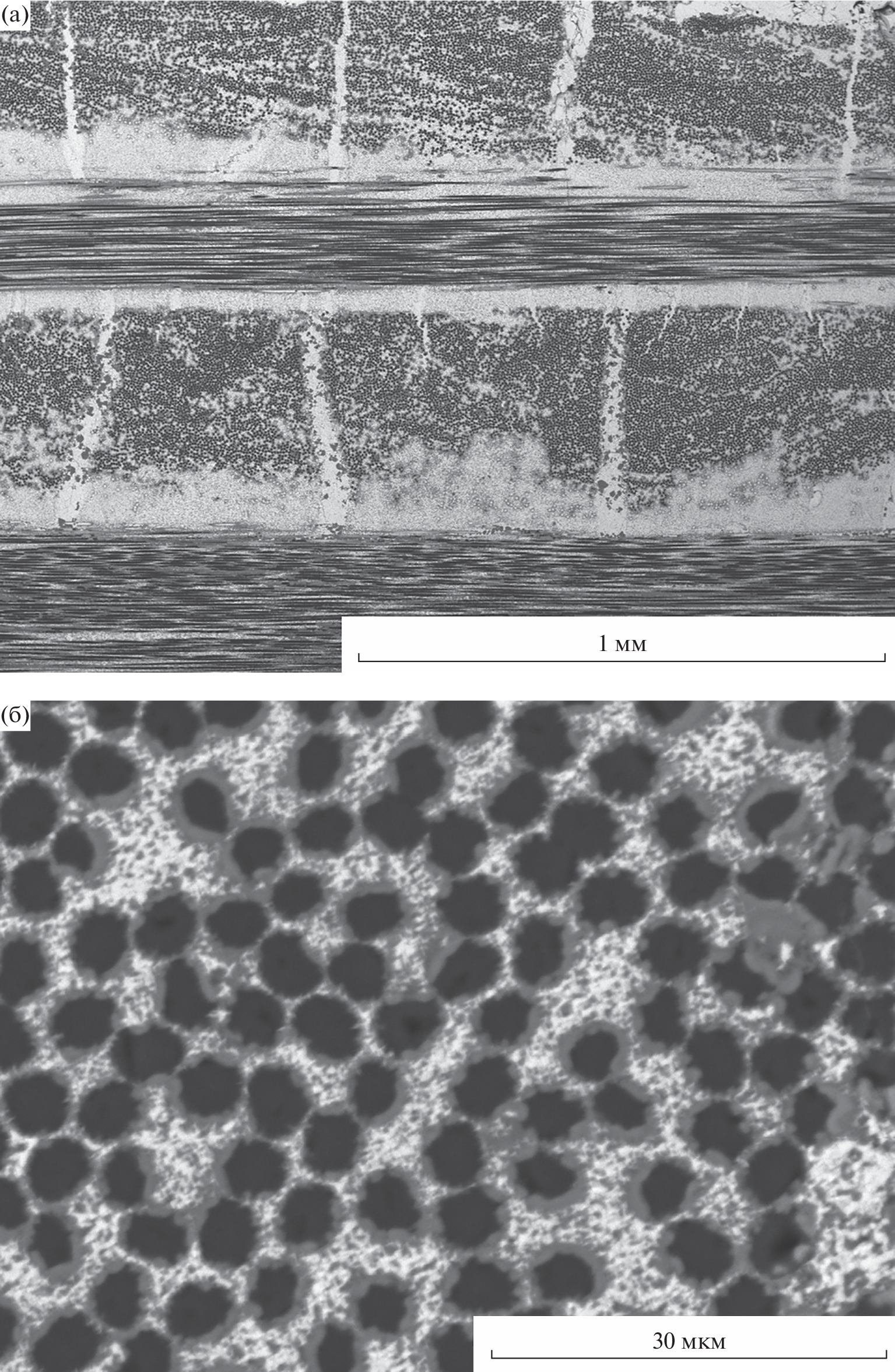 Предложен способ, позволяющий снизить температуру проведения жидкофазного силицирования при формировании керамических композитов с матрицей на основе карбида кремния и диборида циркония с помощью формирования легкоплавкой эвтектики кремния и иттрия. С помощью термодинамических расчетов проведено обоснование и показана целесообразность введения иттрия в силицирующий агент. Впервые проведено жидкофазное силицирование композитов при температуре ниже температуры плавления кремния, что привело к снижению степени деградации углеродного волокна и при этом позволило сохранить высокую плотность и однородность получаемой матрицы.