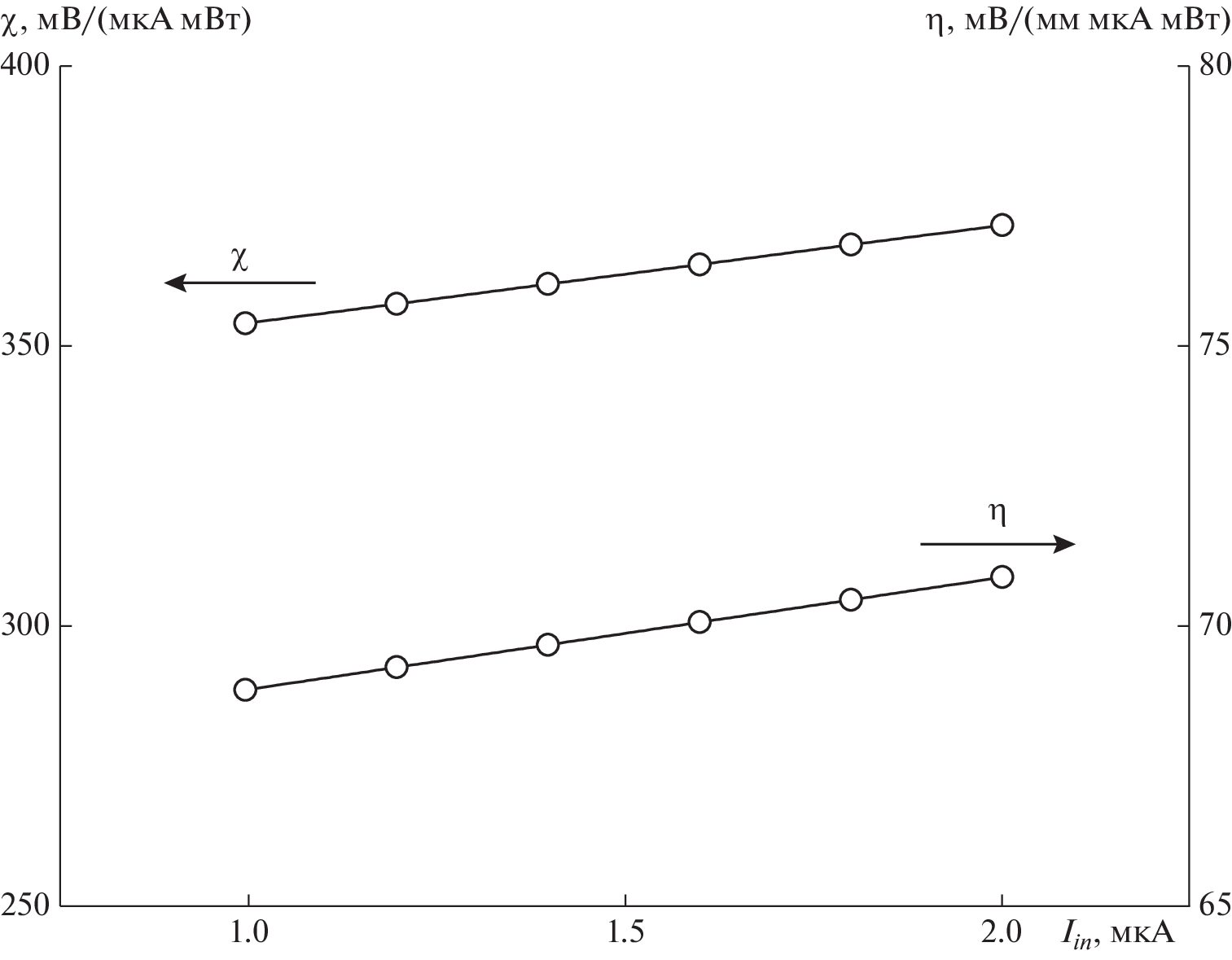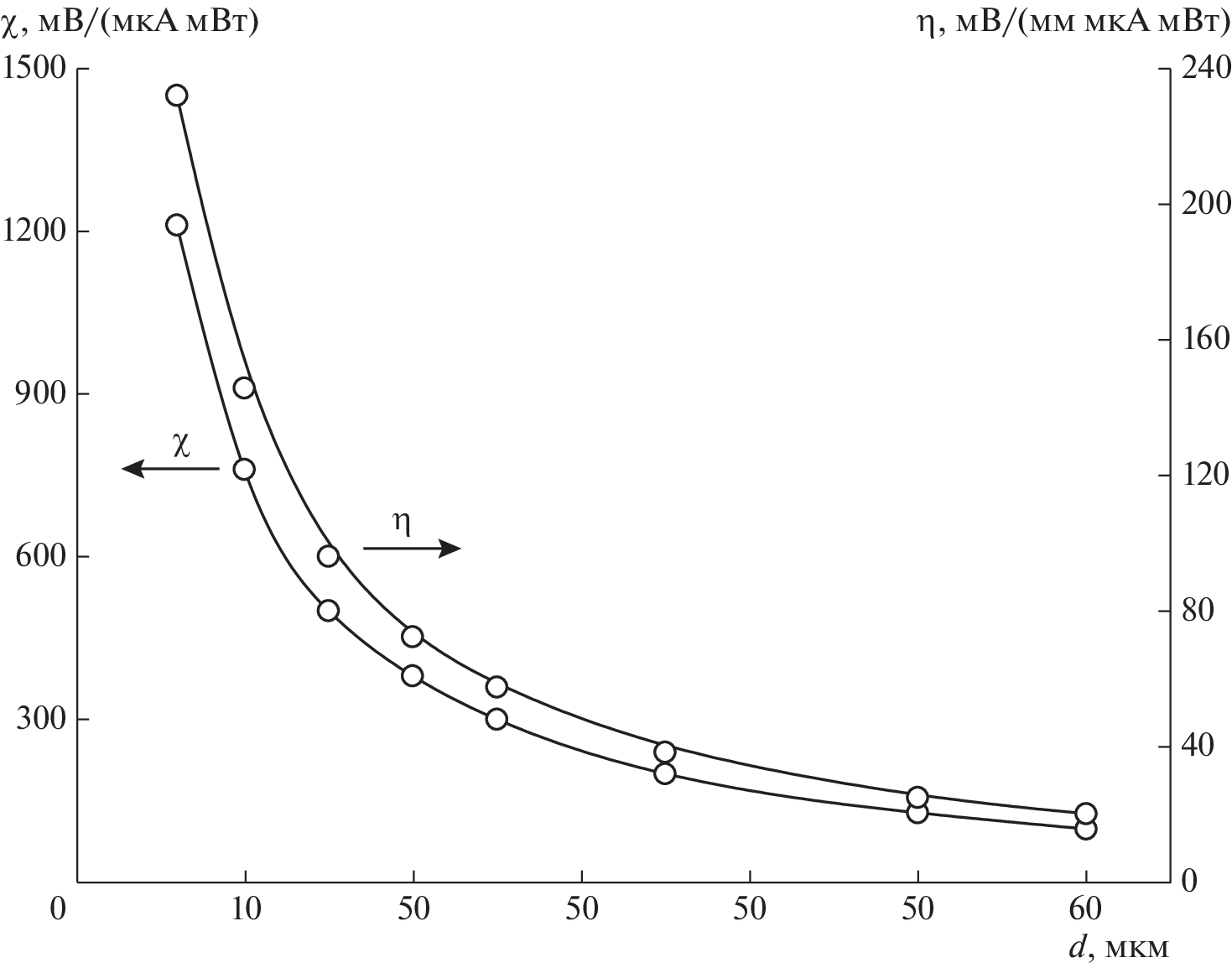 Впервые найдено, что выходное напряжение, координатная и спектральная чувствительность фотоприемного элемента, изготовленного на основе высокоомных светочувствительных слоев CdSe, уменьшаются по гиперболическому закону при увеличении толщины слоев в пределах 6–60 мкм и линейно возрастают при увеличении входного электрического тока. Установленные в работе высокие значения координатной и спектральной чувствительности (70.8 мВ/(мм мкА мВт) и 375 мВ/(мкА мВт) соответственно), которые существенно превышают аналогичные характеристики слоев теллурида кадмия, свидетельствуют о перспективности использования высокоомных слоев CdSe в качестве материала для позиционно-чувствительных фотоприемников.
