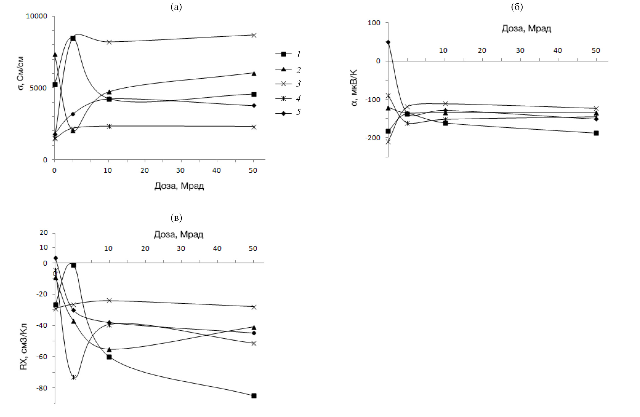 Рис. 1. Зависимости электропроводности σ (а), коэффициента термо-ЭДС α (б), коэффициента Холла RХ (в) экструдированных образцов твердого раствора Bi0.85Sb0.15, легированных 0 (1), 0.001 (2), 0.005 (3), 0.01 (4) и 0.05 ат. % Pb (5), от дозы облучения