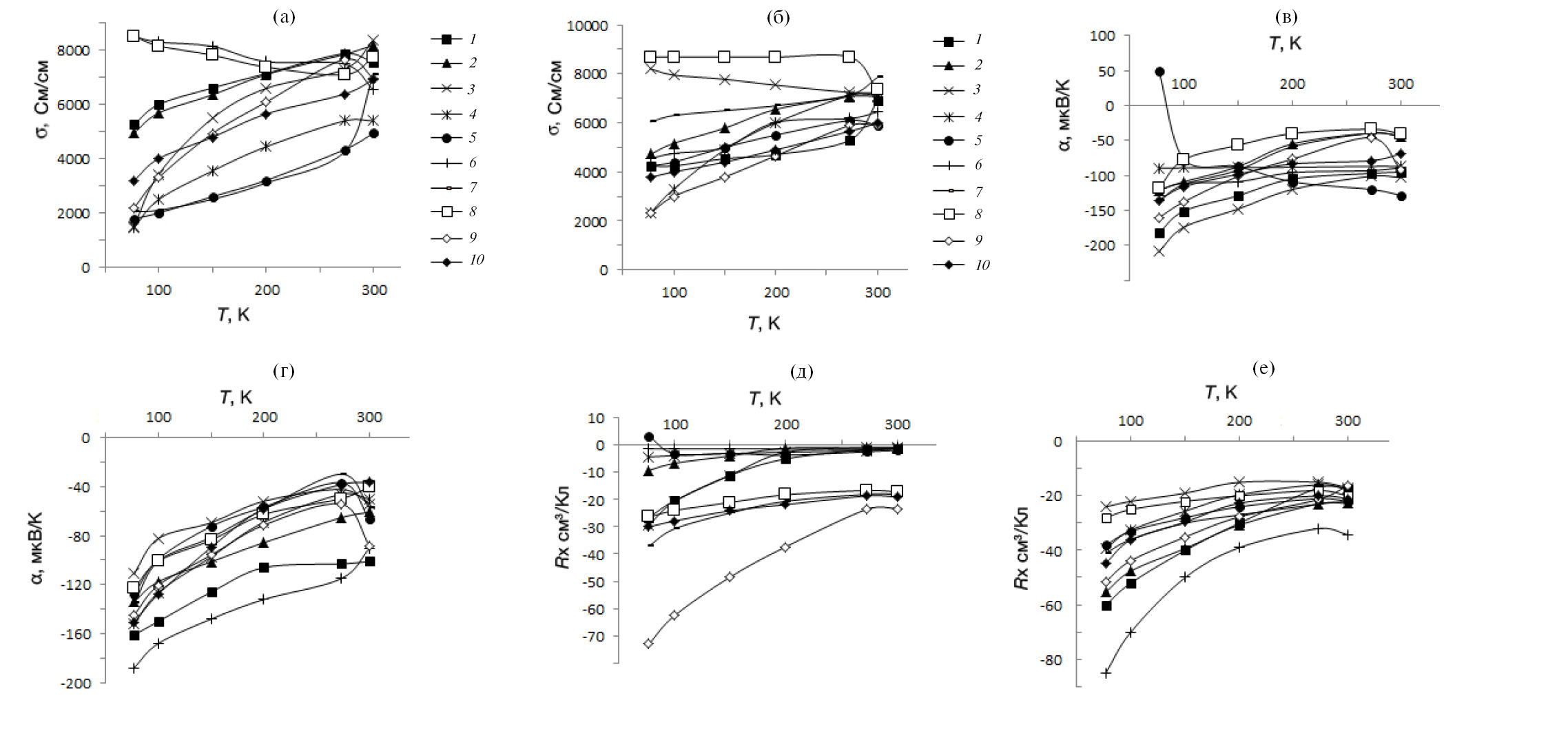 Рис. 2. Температурные зависимости электропроводности σ (а, б), коэффициентов термо-ЭДС α (в, г) и Холла RХ (д, е) экструдированных образцов Bi0.85Sb0.15: а, в, д – необлученные образцы (1–5) и облученные дозой 1 Мрад (6–10); б, г, е – образцы, облученные дозой 10 Мрад (1–5), облученные дозой 50 Мрад и легированные 0 (6), 0.001 (7), 0.005 (8), 0.01 (9), 0.05 ат. % Pb (10)