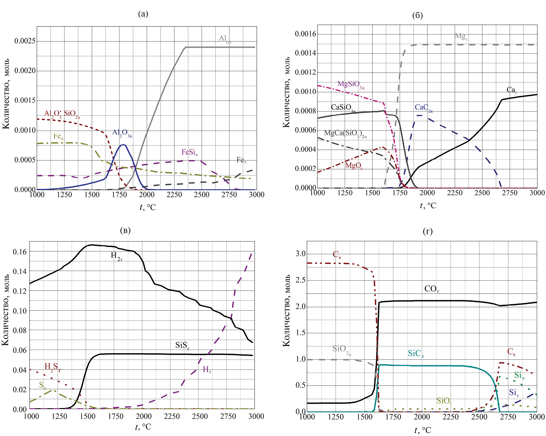Рис. 1. Расчетное содержание соединений алюминия и железа (а), магния и кальция (б), серы и водорода (в), углерода и кремния (г) в продуктах реакции карботермического восстановления кремнезема в зависимости от температуры
